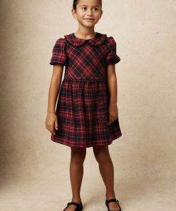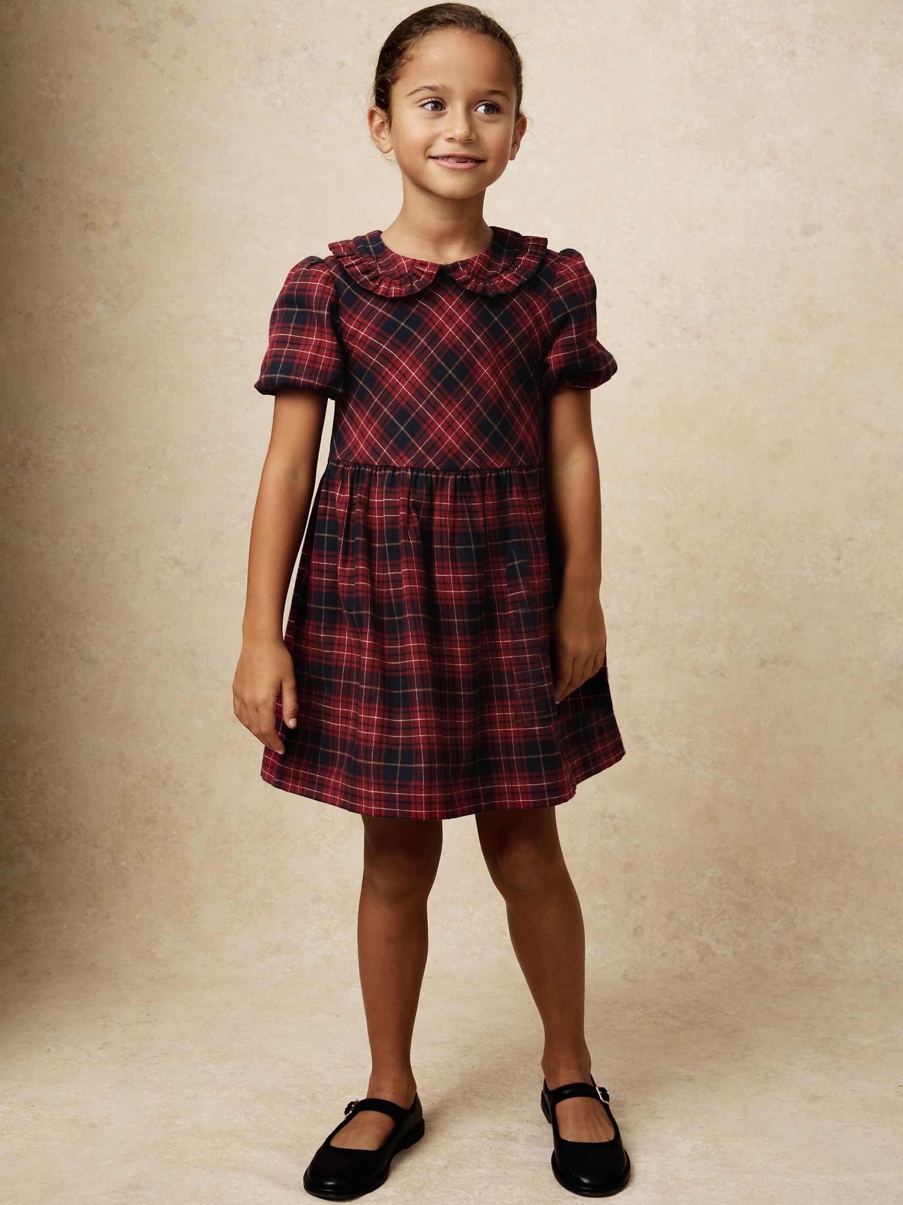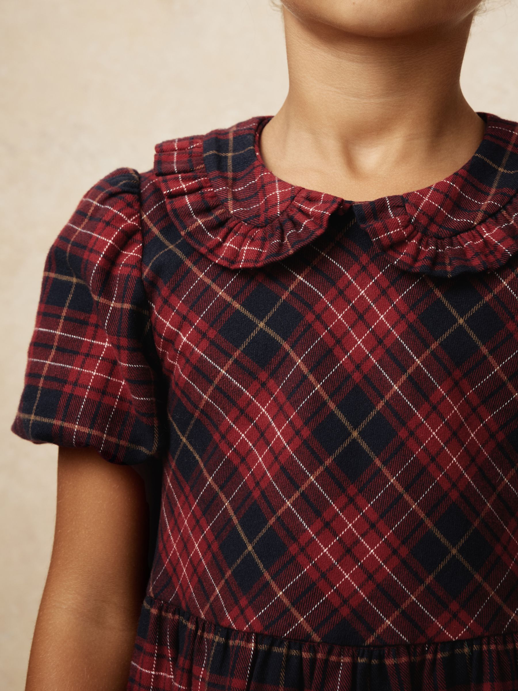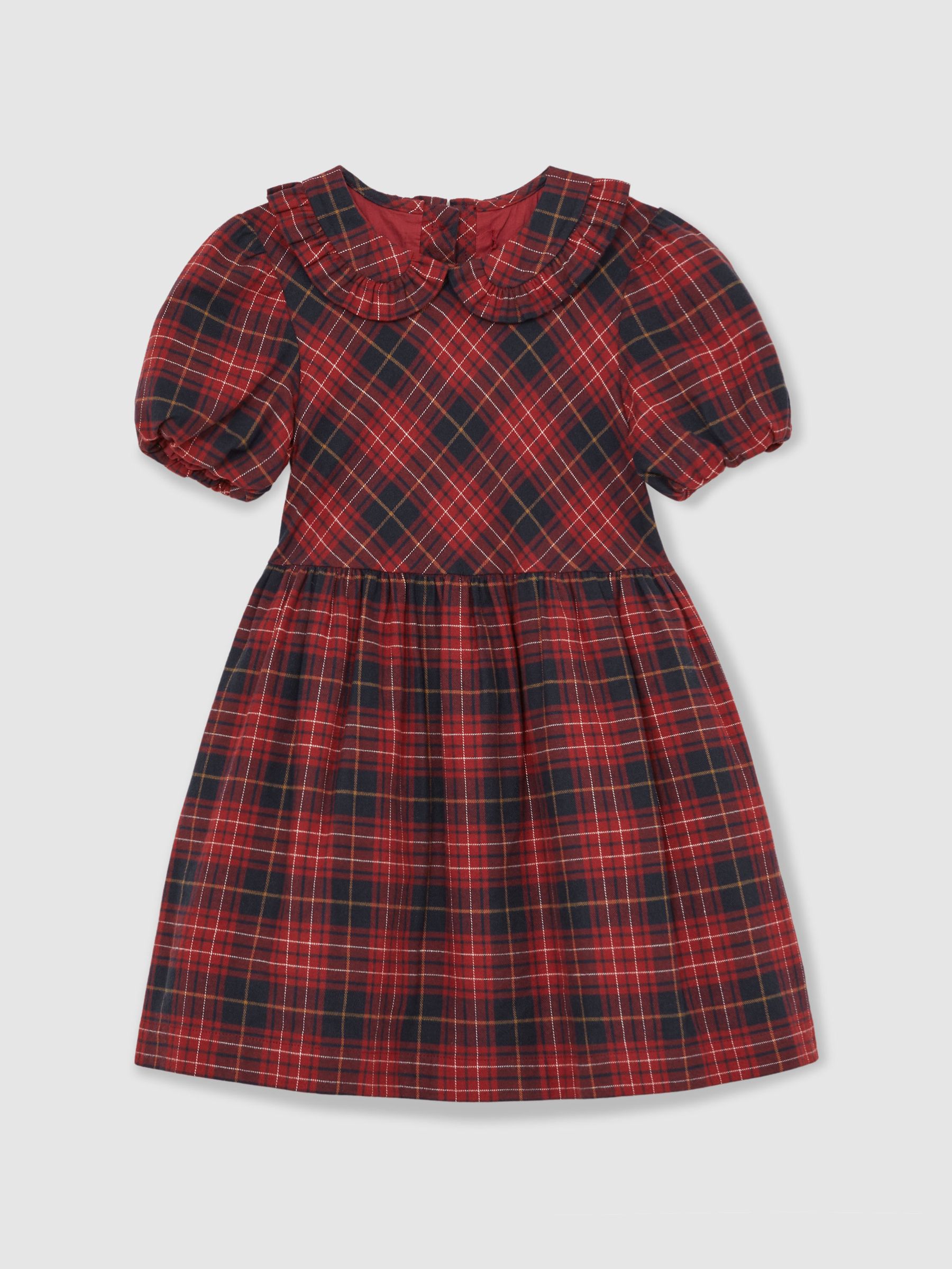 A classic tartan-check pattern and brushed cotton lend the Demi dress a timeless feel, perfect for festive occasions. A frilled Peter Pan collar and short puff sleeves enhance its playful look, while a flared skirt adds to its traditional charm. Cotton Tartan check Peter Pan collar Short puff sleeves Buttons to reverse.