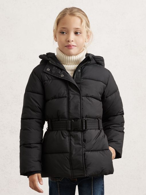 The Ava puffer coat is quilted for warmth and styled with a fixed hood and storm cuffs to protect against the elements. An elasticated belt with a subtly branded buckle secures at the waist, while a concealed zip and press-stud placket complete the sleek silhouette. Quilted construction, fixed hood, Storm cuffs with thumbholes, Fleece-lined press-stud pockets, Elasticated buckled belt, Front zip with press-stud placket.