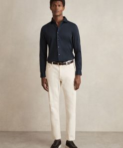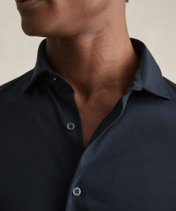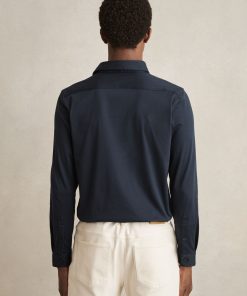 The Navy Duke shirt is crafted from 100% Cotton jersey with an air-water finish for a soft, premium feel. It has a classic spread collar, buttoned cuffs, and a French placket for a clean, refined look. 100% Cotton jersey Air water finish Spread collar Button cuffs French button placket The model is wearing a size M. Measurements of model: Height 6ft 2.5″ / 189cm.