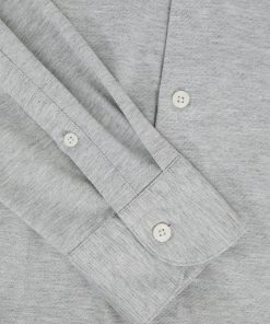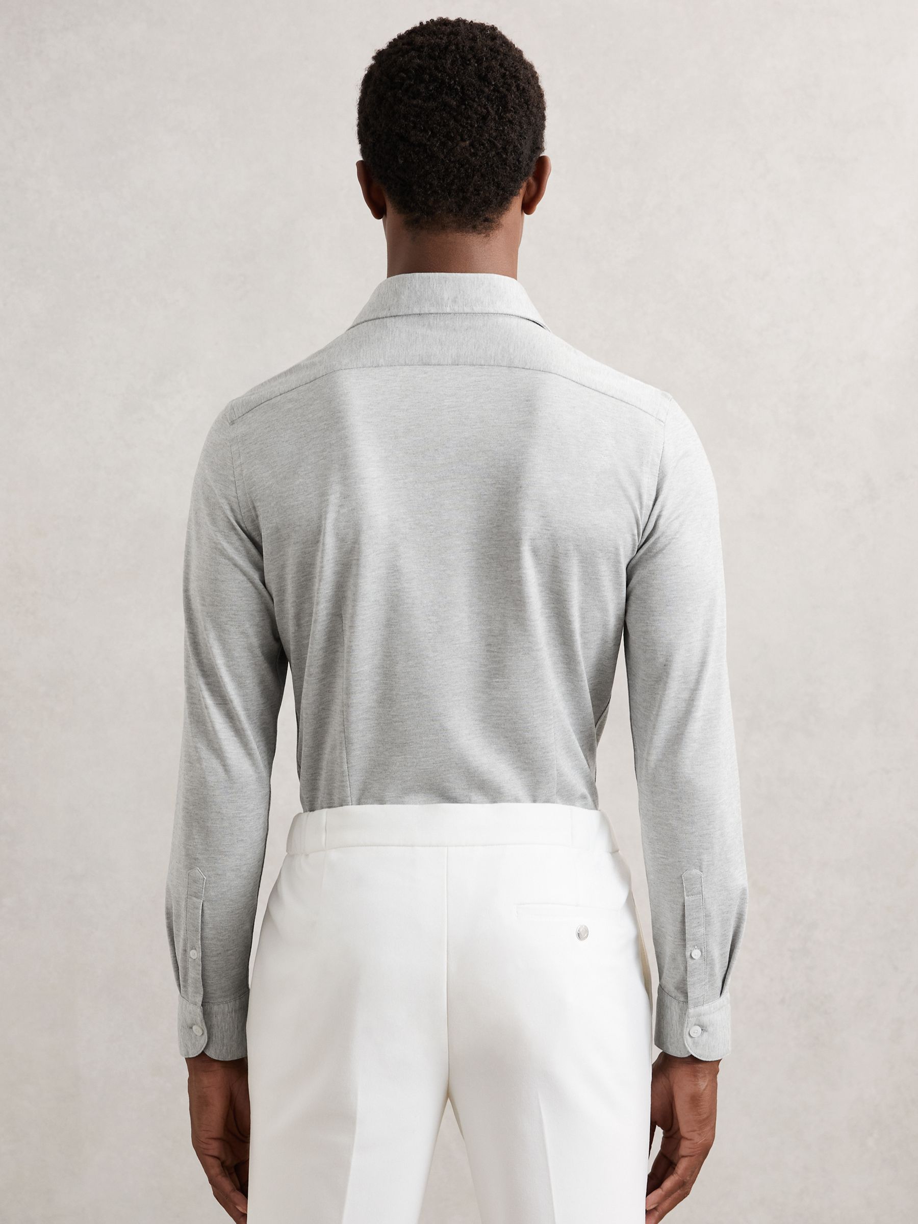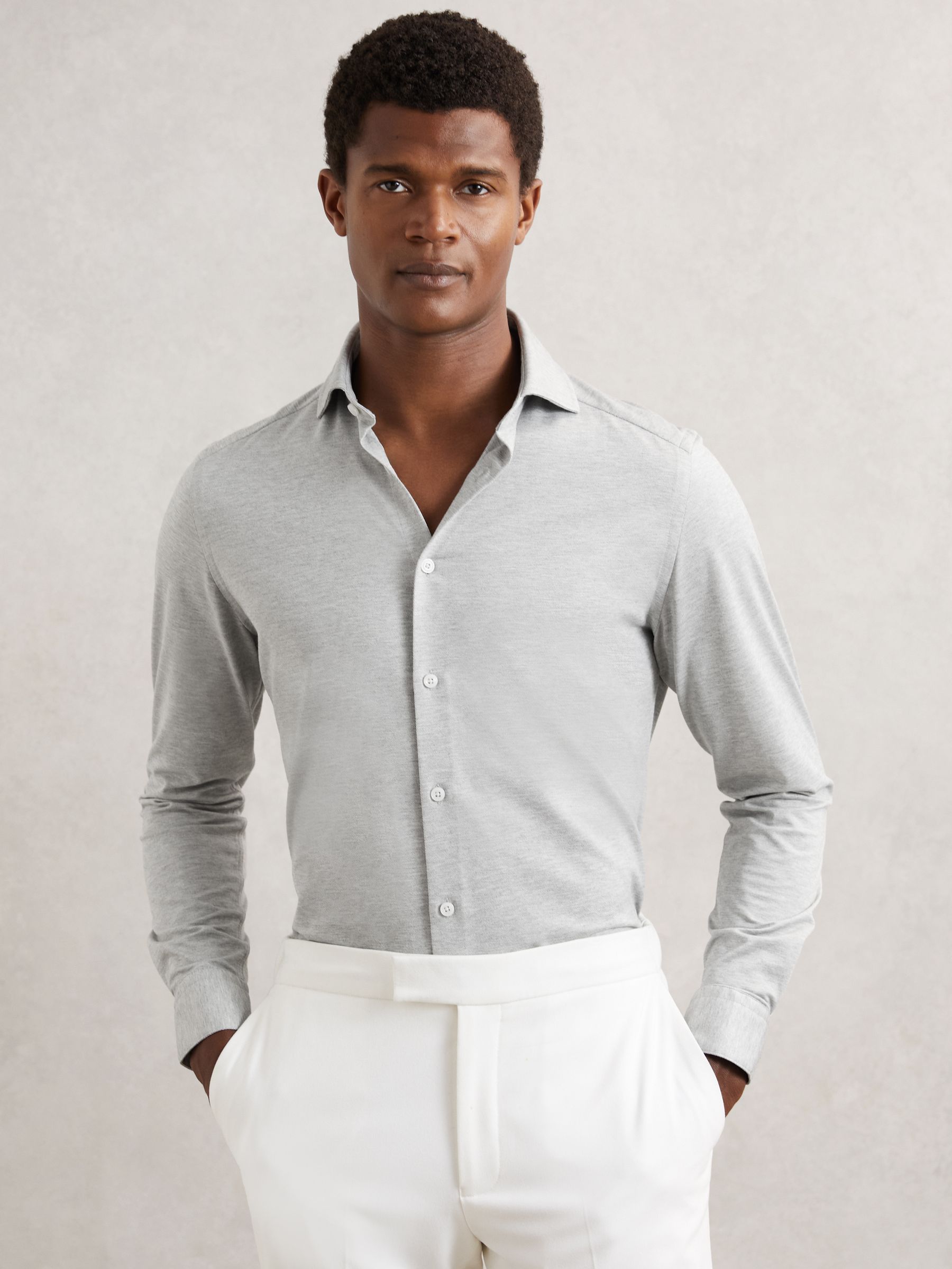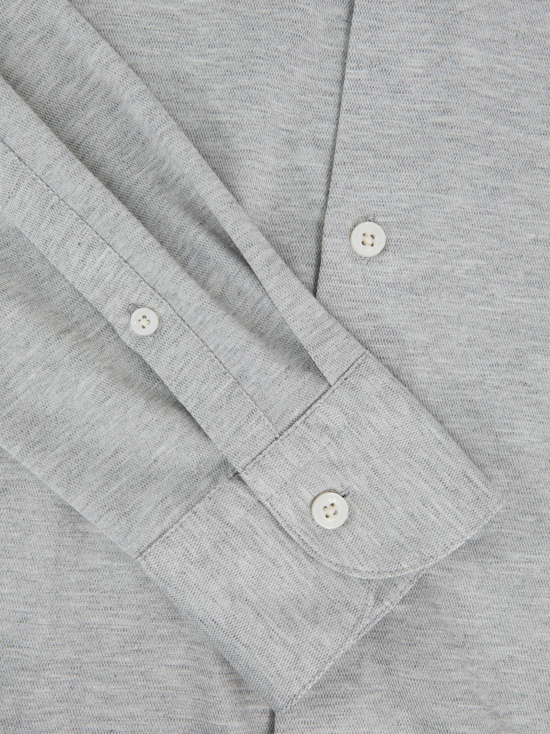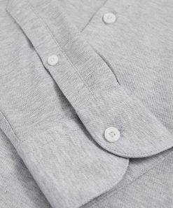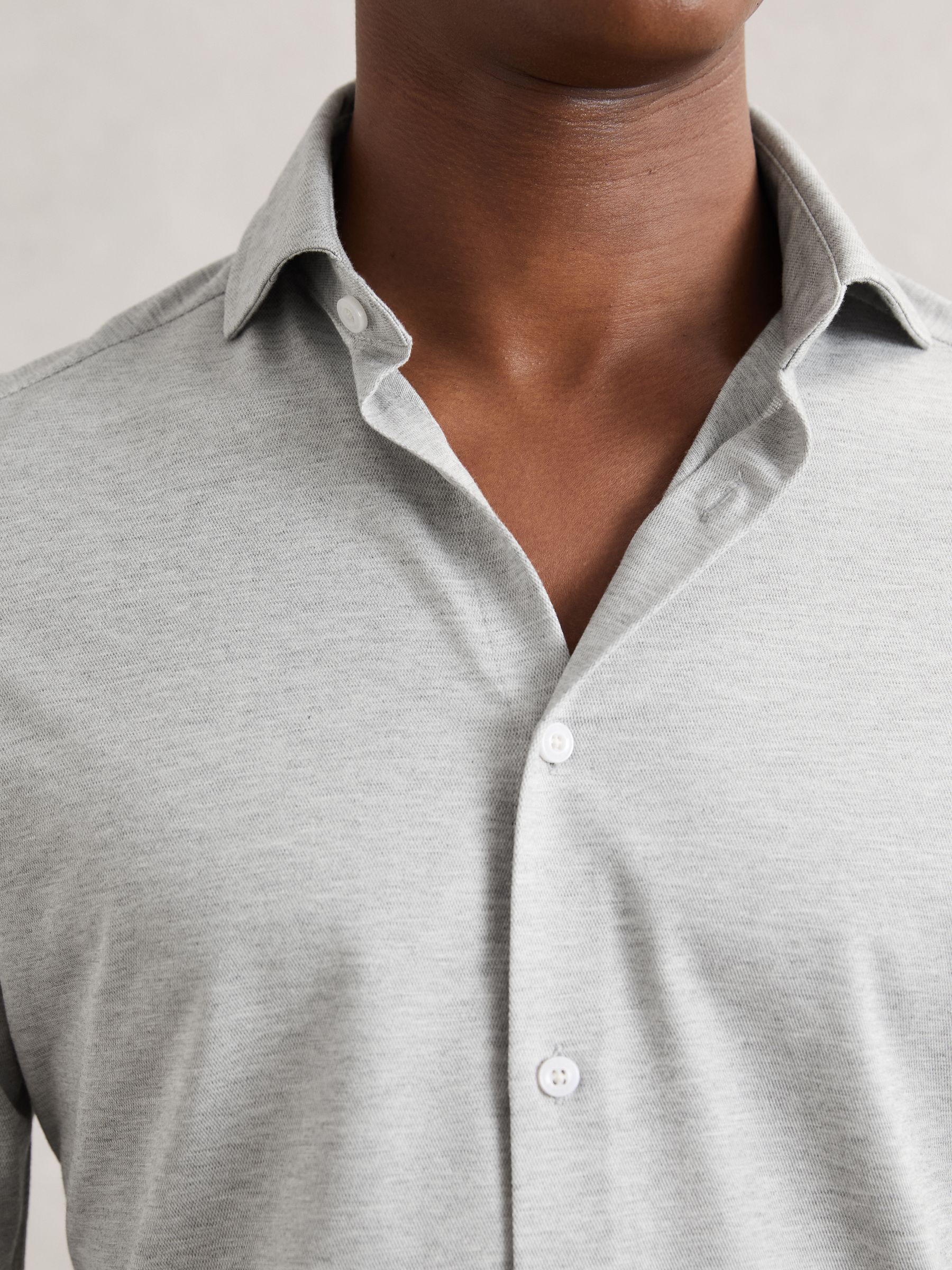 Cut from a soft, cotton-blend jersey in mélange, the Grey Melange Nate shirt effortlessly blends tailored style with casual comfort. A cutaway collar adds a modern edge, whilst a French button placket creates a seamless finish. Cotton-blend jersey Mélange Cutaway collar Button cuffs French button placket The model is wearing a size M. Measurements of model: 6ft 2″ / 188cm.