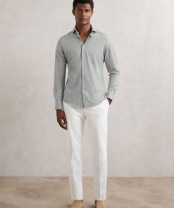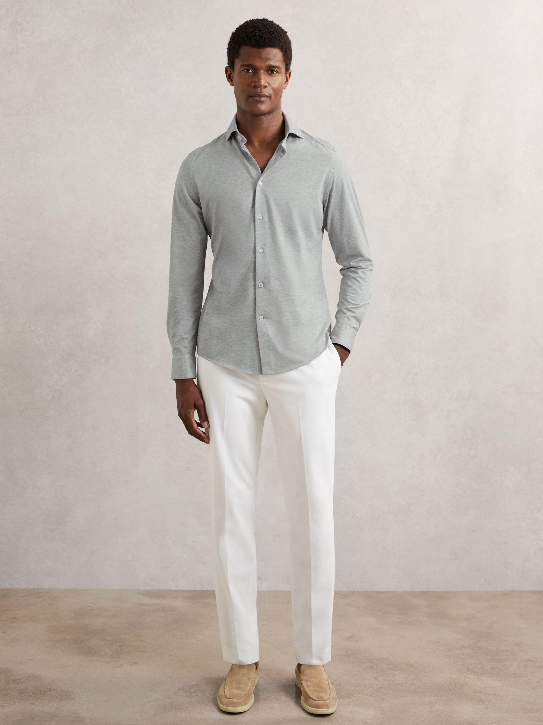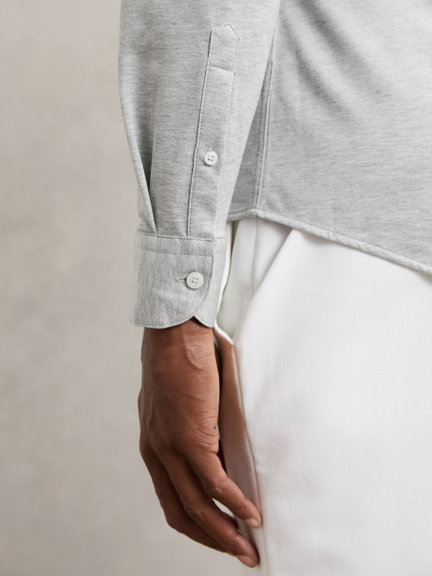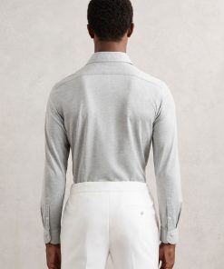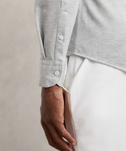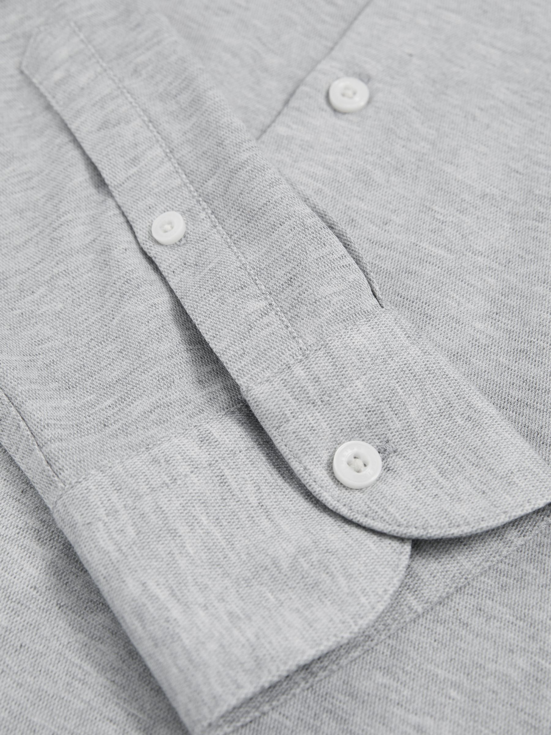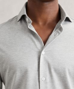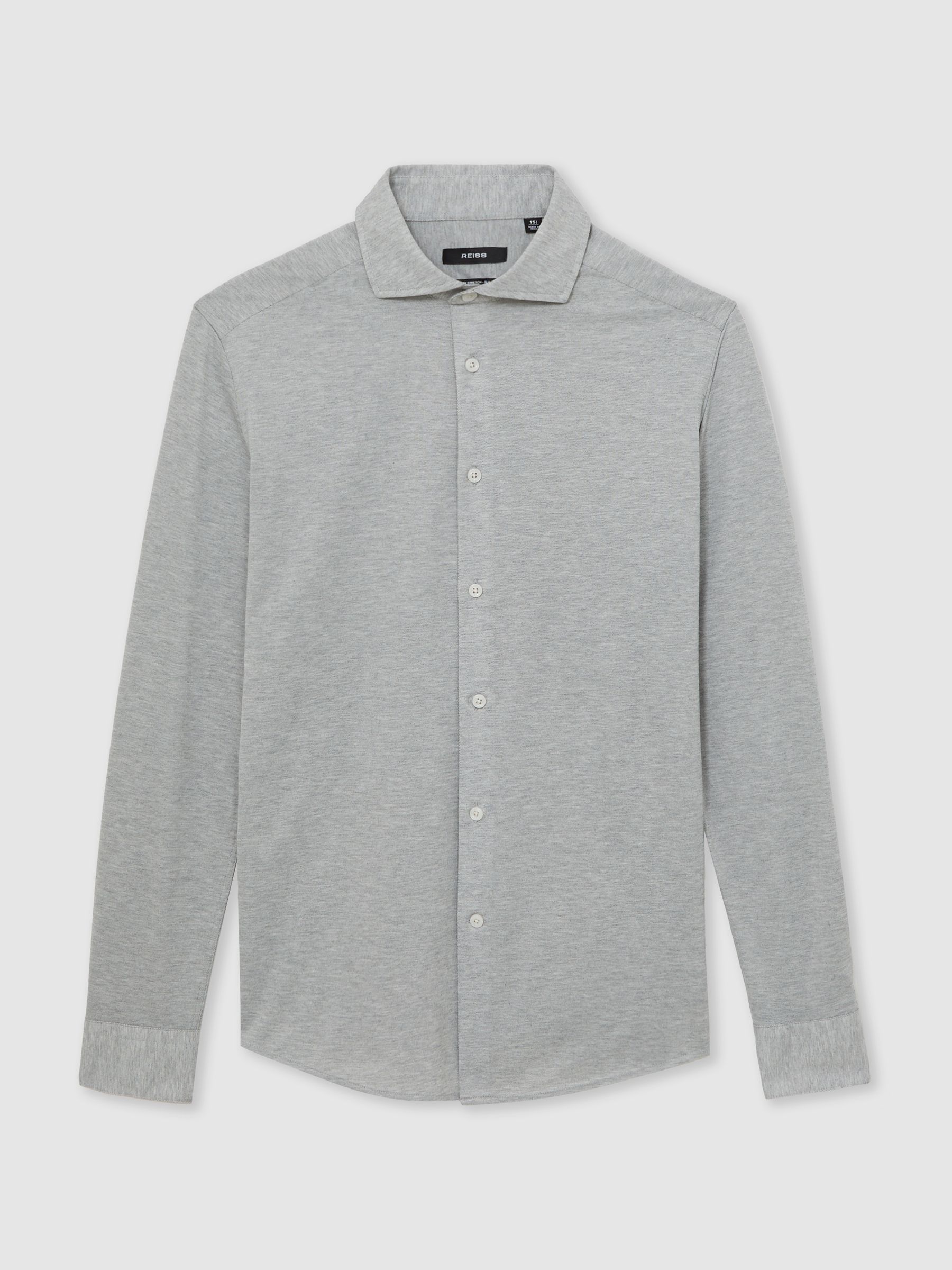 Cut from a soft, cotton-blend jersey in mélange, the Grey Melange Nate shirt effortlessly blends tailored style with casual comfort. A cutaway collar adds a modern edge, whilst a French button placket creates a seamless finish. Cotton-blend jersey Mélange Cutaway collar Button cuffs French button placket The model is wearing a size M. Measurements of model: 6ft 2″ / 188cm.