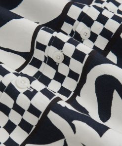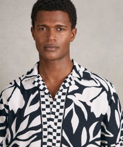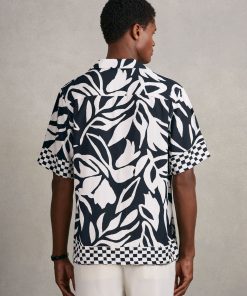 The Beattie shirt showcases a bold floral block print paired with a striking checkerboard border for graphic contrast. A classic Cuban collar and short sleeves complete it's relaxed style. Floral block print. Cuban collar. Checkerboard border. Front buttons. The model is wearing a size M. Measurements of model: Height 6ft 2.5 / 189cm.