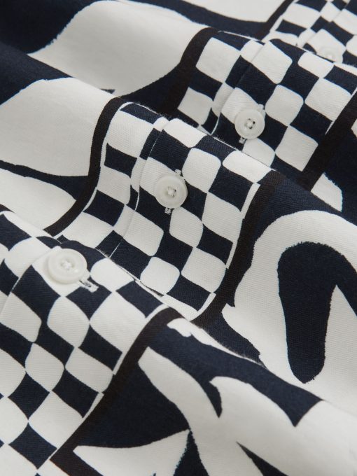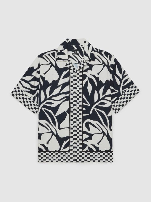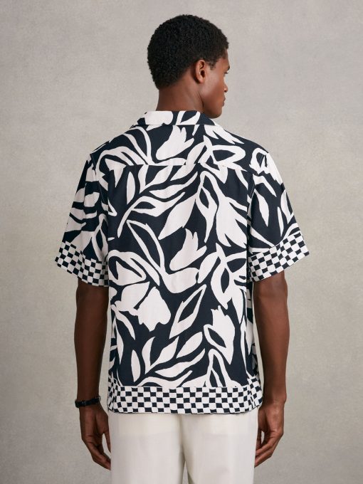 The Beattie shirt showcases a bold floral block print paired with a striking checkerboard border for graphic contrast. A classic Cuban collar and short sleeves complete it's relaxed style. Floral block print. Cuban collar. Checkerboard border. Front buttons. The model is wearing a size M. Measurements of model: Height 6ft 2.5 / 189cm.