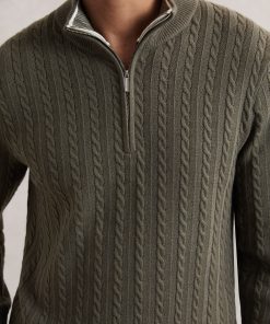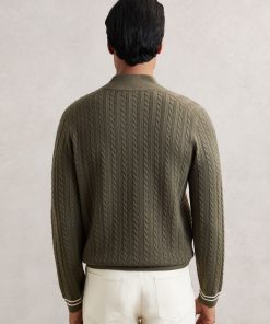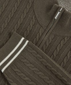 The Tuscano jumper is a classic half-zip style, crafted with wool and featuring a narrow cable knit pattern. Designed with ribbing at the funnel neck, hem and cuffs and finished with contrast stripes. Made with wool. Cable knit. Funnel neck. Half zip. Ribbed neck, hem and cuffs.