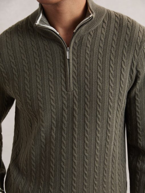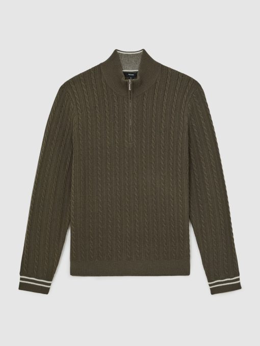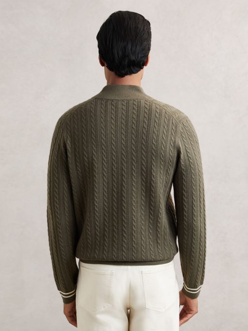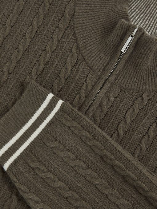 The Tuscano jumper is a classic half-zip style, crafted with wool and featuring a narrow cable knit pattern. Designed with ribbing at the funnel neck, hem and cuffs and finished with contrast stripes. Made with wool. Cable knit. Funnel neck. Half zip. Ribbed neck, hem and cuffs.