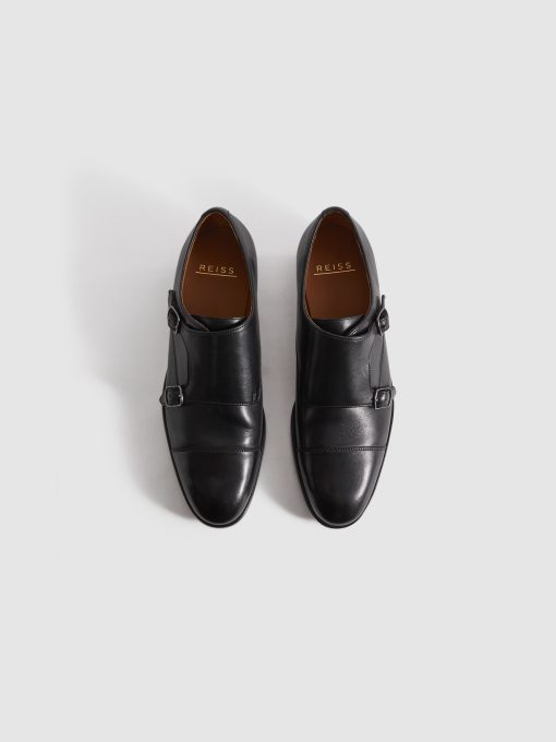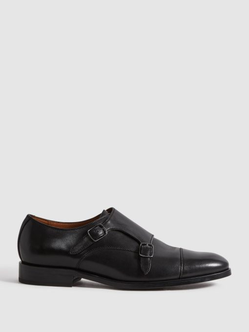 Structured, high-shine black leather is cut into a round-toe silhouette with double monk straps across the front. The Black Amalfi shoes are complete with a contrast leather lining. 100% Leather Double monk straps Rounded toe Contrast leather lining