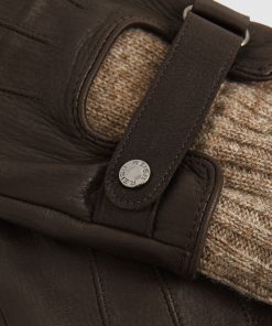 Inspired by classic driving gloves, Dark Brown Sanford is crafted from supple deer leather with a mélange-knit insert that extends into ribbed cuffs. A press-stud strap secures across the top wrist. 100% Deer leather Wool-blend ribbed cuffs Tonal topstitching Press-stud strap