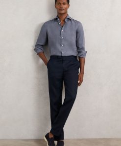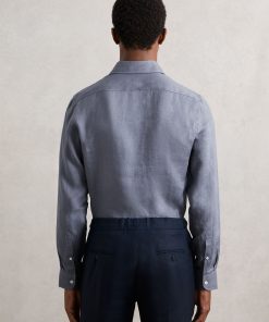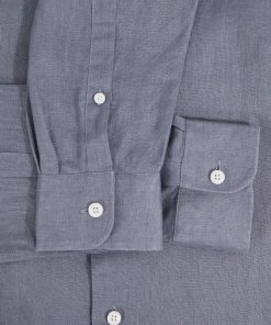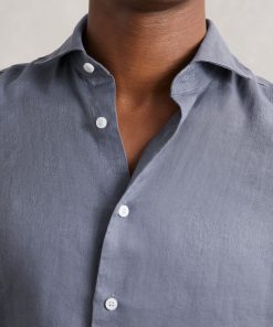 The Air Force Blue Ruban shirt is crafted from 100% linen, offering a breathable and lightweight option for tailored looks. The cutaway collar adds a sharp, modern touch, while the French button placket enhances its refined, versatile design. 100% Linen Cutaway collar Button cuffs French button placket