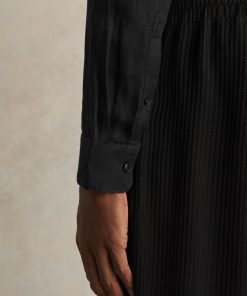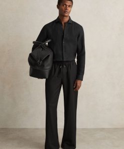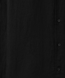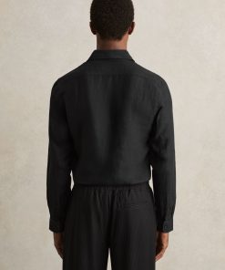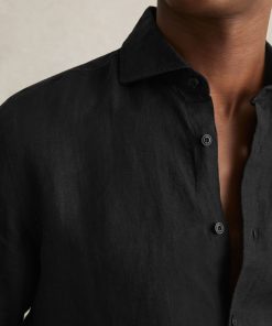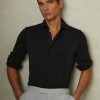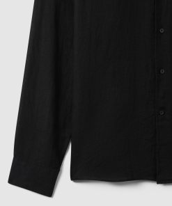 The black long-sleeve Ruban shirt is designed from a lightweight, breathable linen fabric with a slight marled texture, perfect for resort destinations. 100% linen Marled texture Cutaway collar Button-front closure Long sleeves Buttoned cuffs The model is wearing a size M. Measurements of model: 6ft 2″ / 188cm.