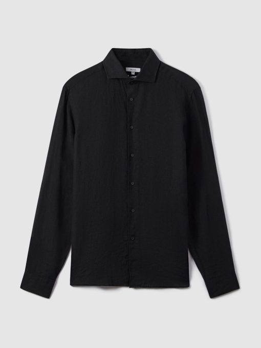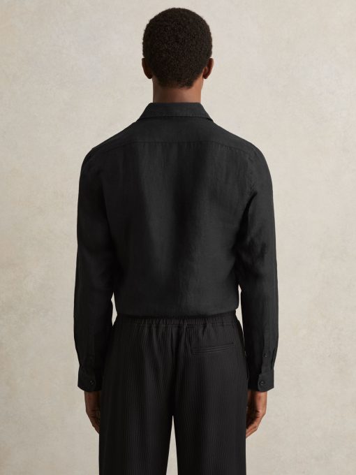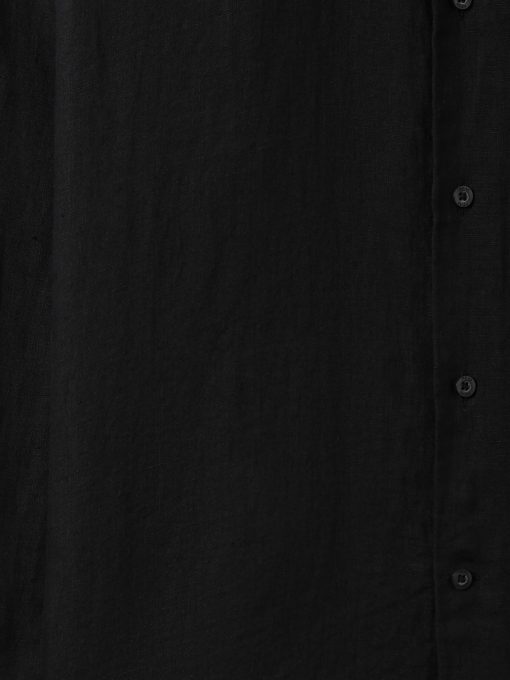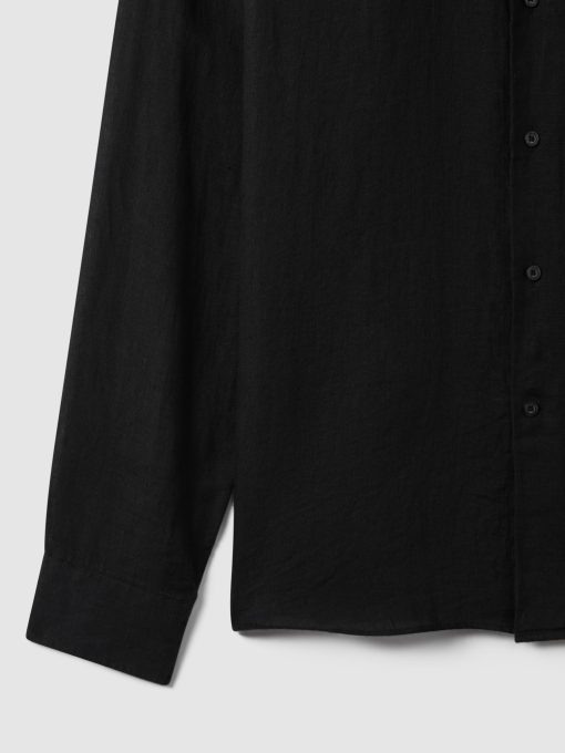 The black long-sleeve Ruban shirt is designed from a lightweight, breathable linen fabric with a slight marled texture, perfect for resort destinations. 100% linen Marled texture Cutaway collar Button-front closure Long sleeves Buttoned cuffs The model is wearing a size M. Measurements of model: 6ft 2″ / 188cm.