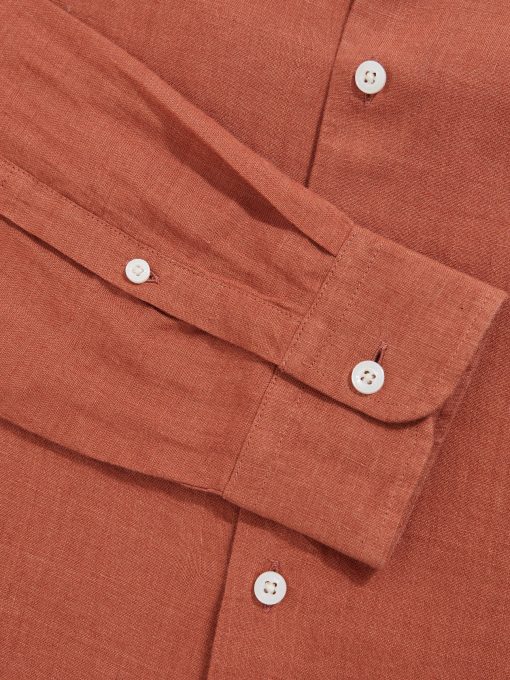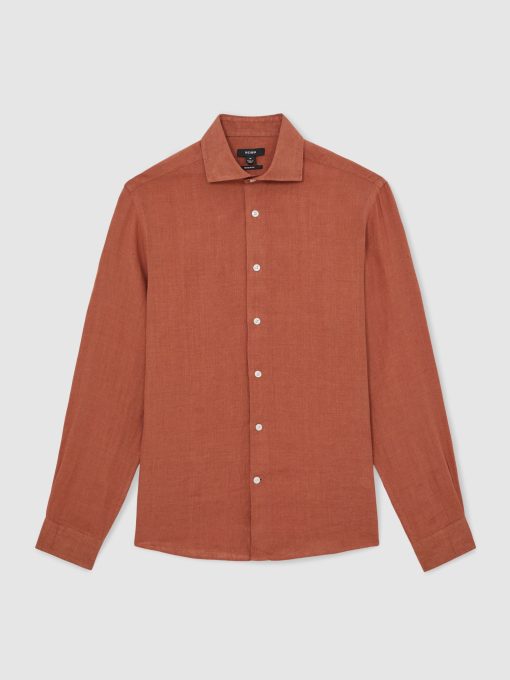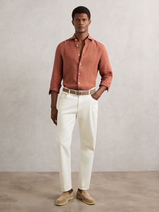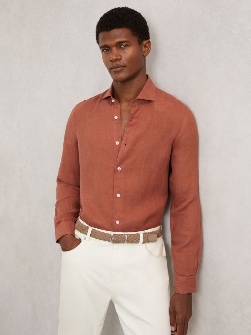 Engineered from a lightweight, linen fabrication with a subtle marl texture, the olive Ruban shirt marries classic comfort with a versatile style. Find the perfect pairing in our new arrivals. 100% linen Cutaway collar. Full buttoned placket. Long sleeves. Curved sleeve cuffs. Regular fit.
