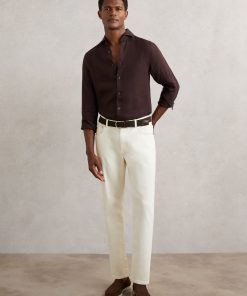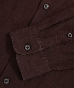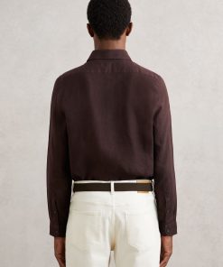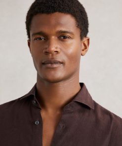 The dark brown Ruban shirt is crafted from 100% linen, offering a breathable and lightweight option for tailored looks. The cutaway collar adds a sharp, modern touch, while the French button placket offers a polished finish. 100% linen Cutaway collar Button cuffs French button placket The model is wearing a size M. Measurements of model: 6ft 2″ / 188cm.