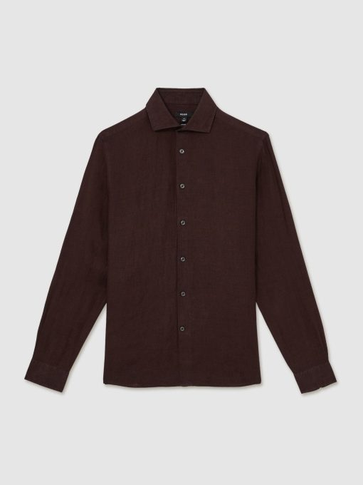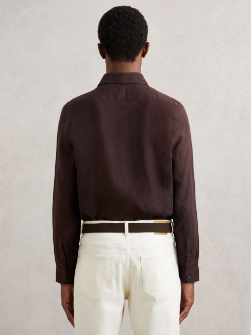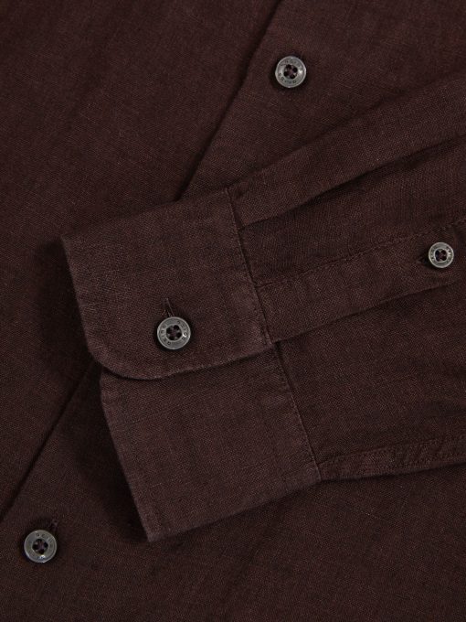 The dark brown Ruban shirt is crafted from 100% linen, offering a breathable and lightweight option for tailored looks. The cutaway collar adds a sharp, modern touch, while the French button placket offers a polished finish. 100% linen Cutaway collar Button cuffs French button placket The model is wearing a size M. Measurements of model: 6ft 2″ / 188cm.