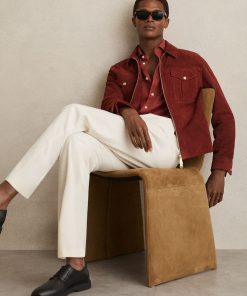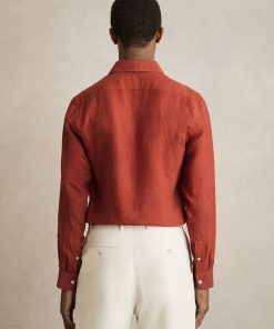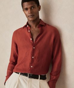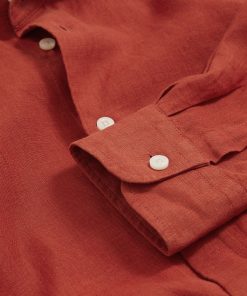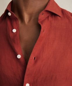 The Paprika Red Ruban shirt is crafted from 100% linen, offering a breathable and lightweight option for tailored looks. The cutaway collar adds a sharp, modern touch, while the French button placket offers a polished finish. 100% Linen Cutaway collar Button cuffs French button placket The model is wearing a size M.Measurements of model: Height 6ft 2.5″ / 189cm.