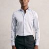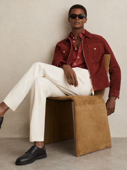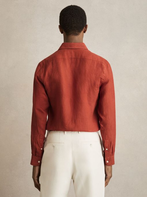 The Paprika Red Ruban shirt is crafted from 100% linen, offering a breathable and lightweight option for tailored looks. The cutaway collar adds a sharp, modern touch, while the French button placket offers a polished finish. 100% Linen Cutaway collar Button cuffs French button placket The model is wearing a size M.Measurements of model: Height 6ft 2.5″ / 189cm.