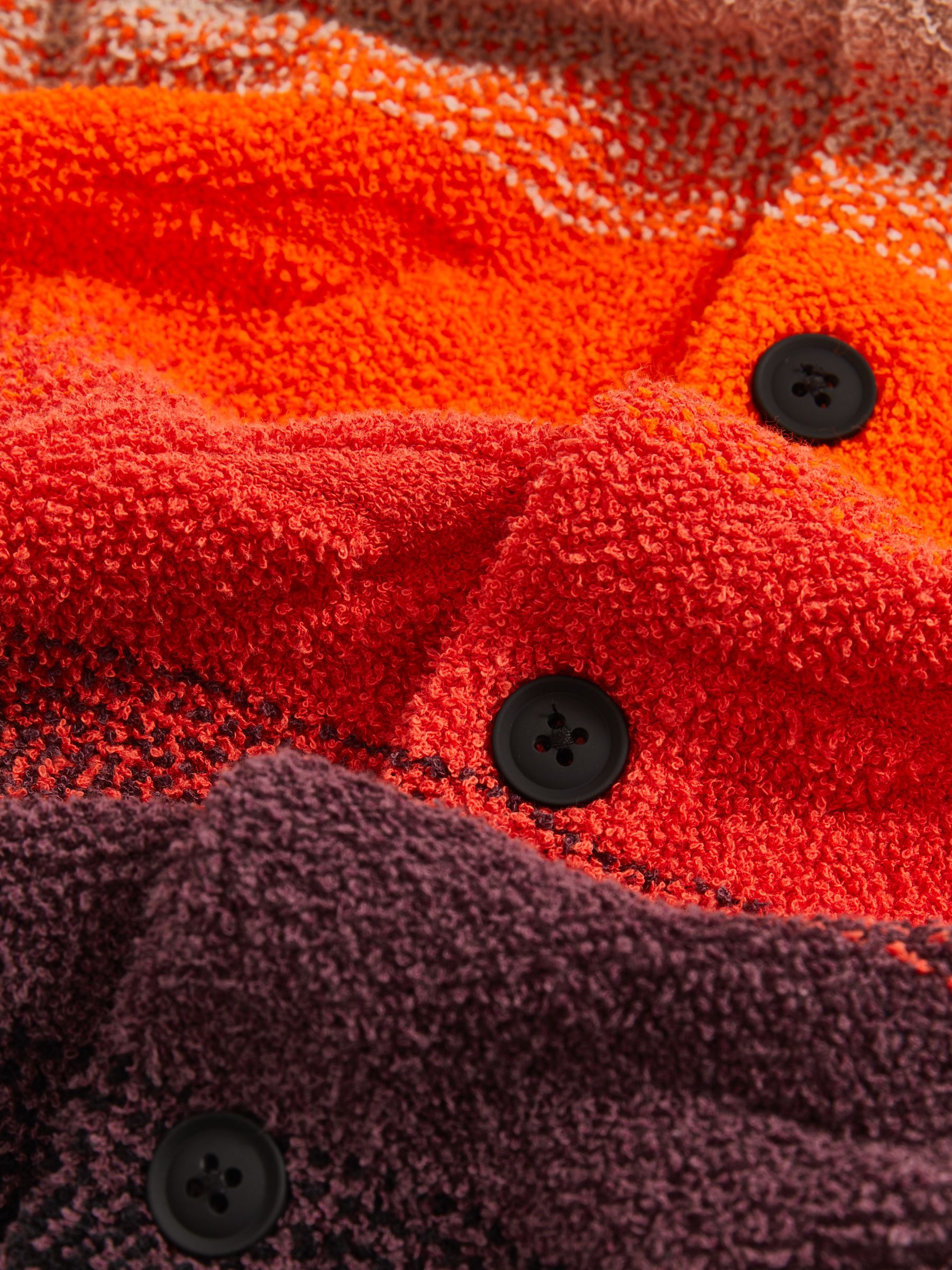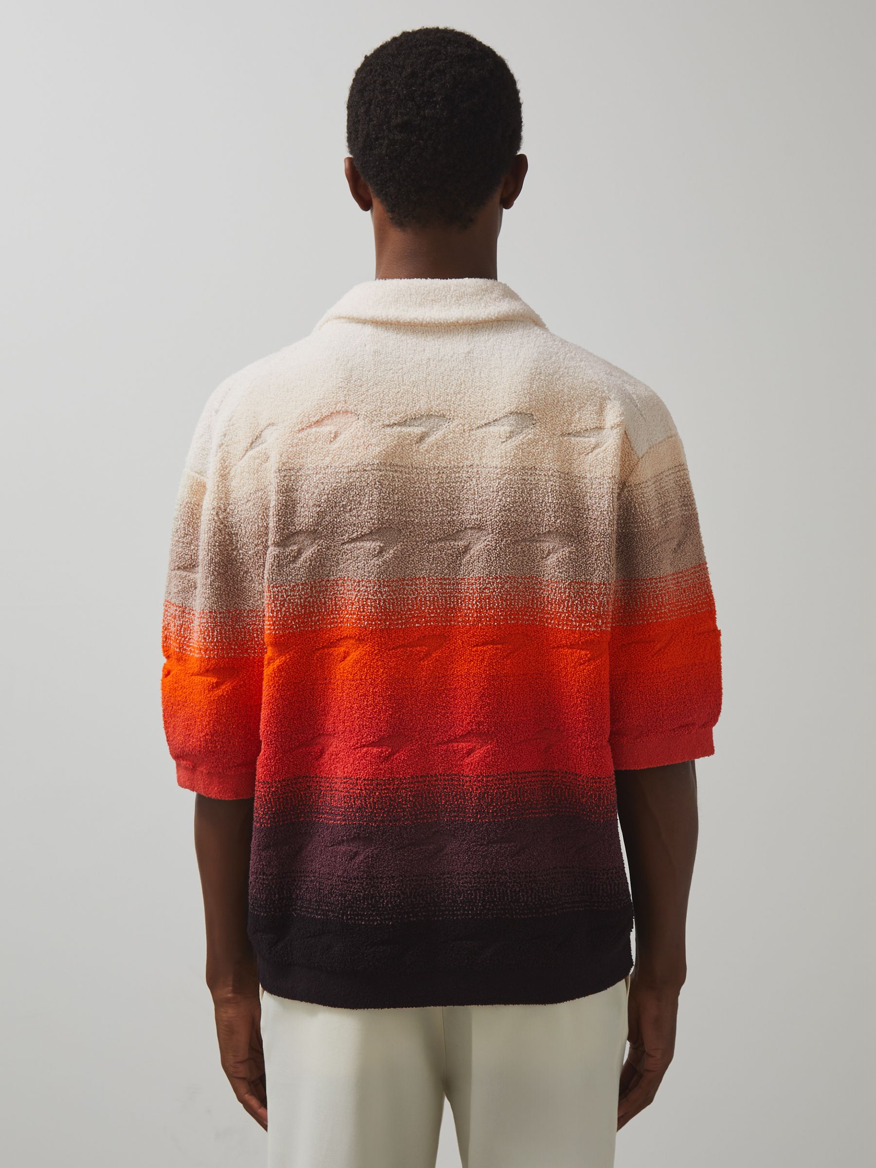 The Pacific shirt, crafted from soft cotton-blend towelling with an ombré finish, is a standout summer staple. A subtly knitted McLaren Formula 1 Team Speedmark pattern adds signature detail, while the Cuban collar enhances its laid-back appeal. Cotton-blend towelling Ombré effect McLaren F1 Team Speedmark pattern McLaren F1 Team brand tag on the side Cuban collar Front buttons Presenting the Reiss x McLaren Formula 1 Team Collection Season 02, our exclusive collaboration with the McLaren Formula 1 Team. The model is wearing a size M. Measurements of model: Height 6ft 2.5″ / 189cm.