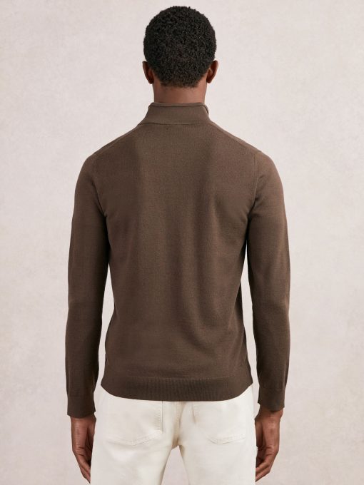 The Chocolate Brown Blackhall jumper is a classic half-zip style, crafted from extra-fine merino wool. A finely ribbed hem and cuffs complete the look. 100% Merino wool Funnel neck Half zip Ribbed hem and cuffs The model is wearing a size M. Measurements of model: Height 6ft 2.5″ / 189cm.