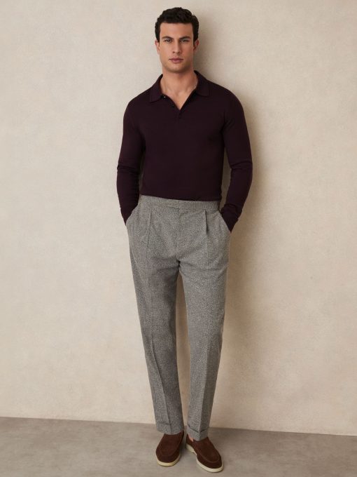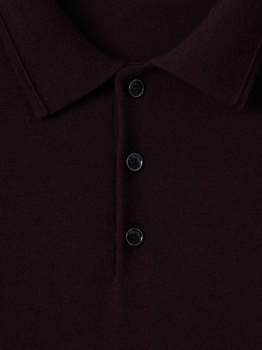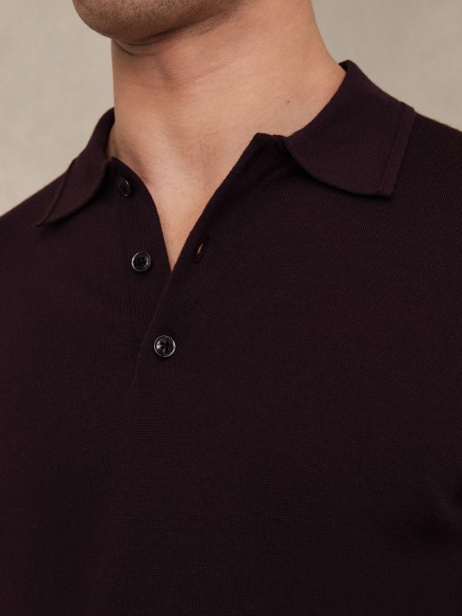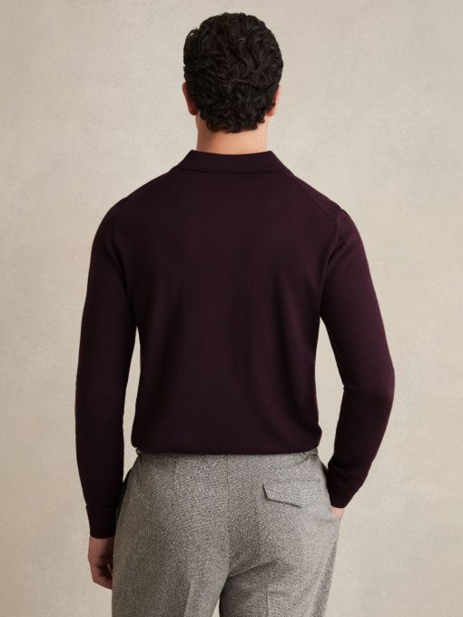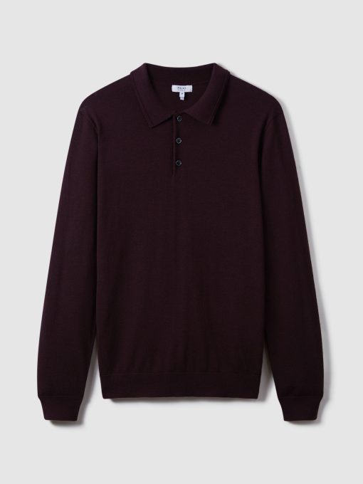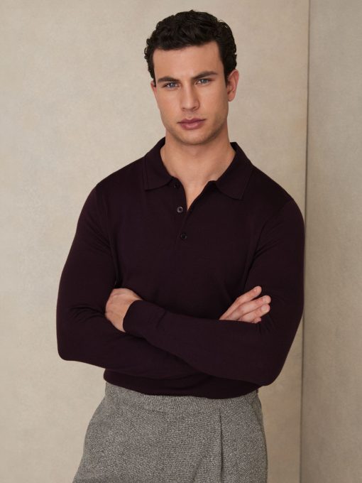 Reiss Men’s Merino Wool Long-sleeve Polo Shirt In Dark Bordeaux | Dark Bordeaux