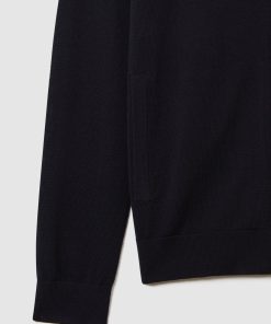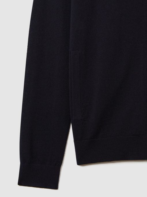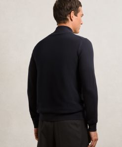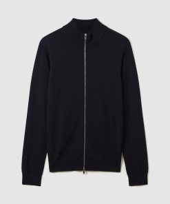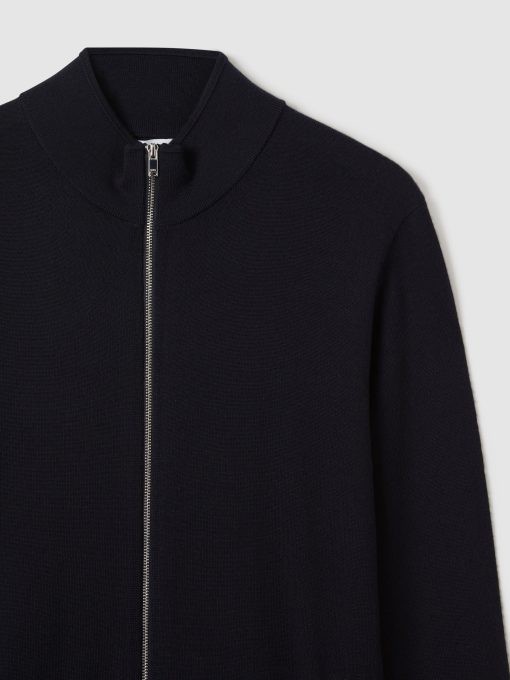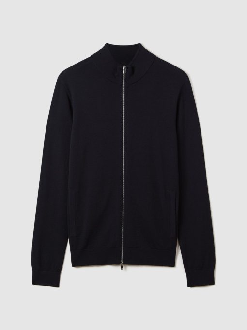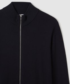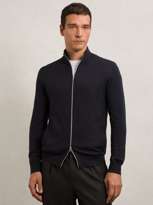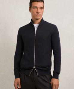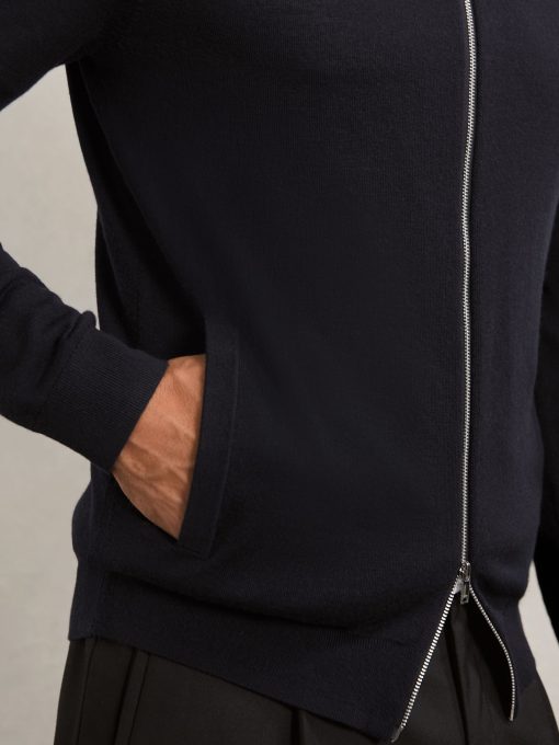 Crafted from luxurious merino wool, the navy Hampshire cardigan features a funnel neckline and a dual zip-front closure for customisable wear. Merino wool Funnel neckline Dual zip-front closure Side-slip pockets Long sleeves The model is wearing a size M. Measurements of model: 6ft 2″ / 188cm.