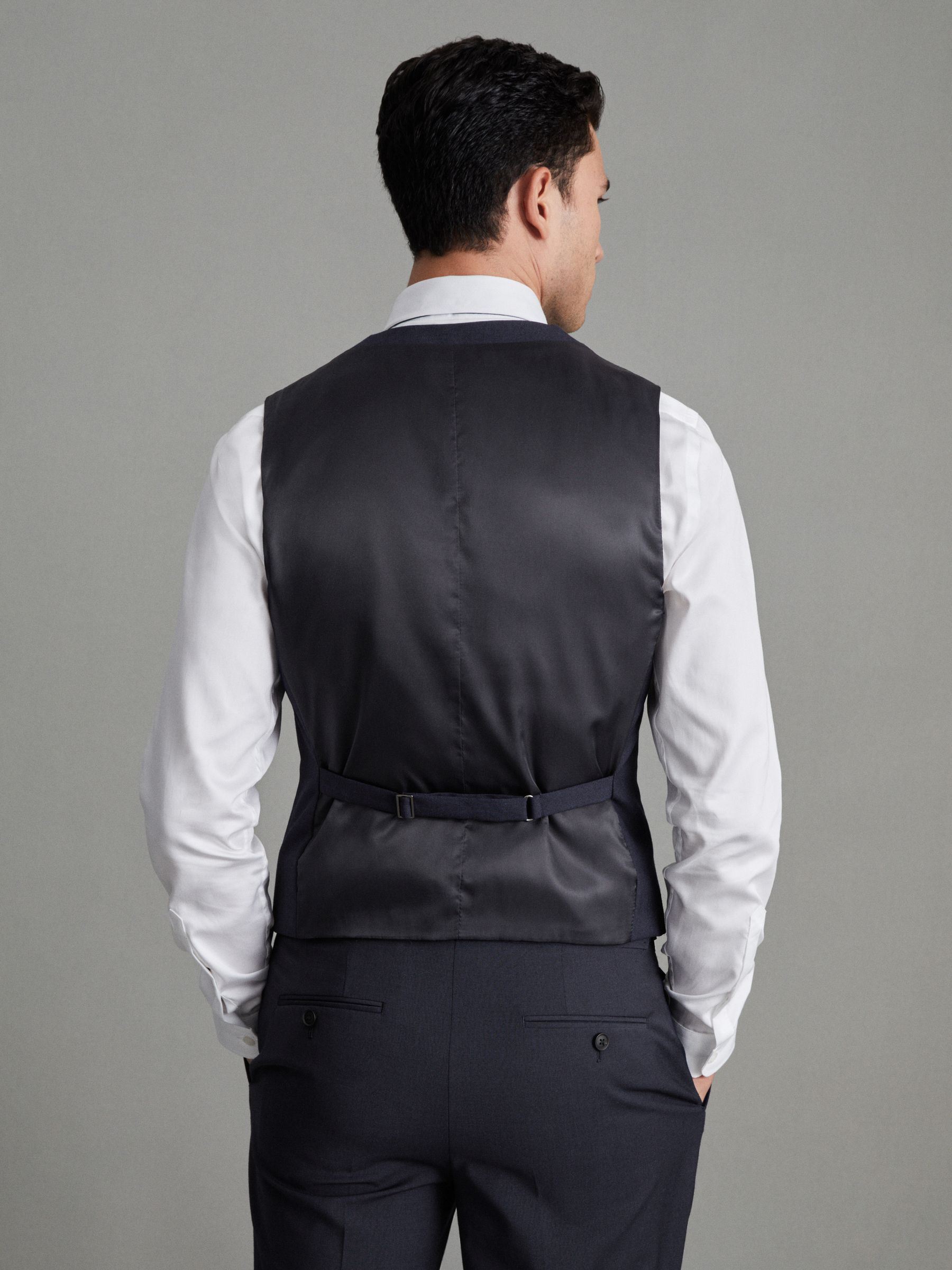 Crafted from a luxurious wool blend, the Hope modern-fit waistcoat in navy is the easiest route to tailored perfection. It boasts a subtle stretch, helping to maintain the shape of the garment and increase comfort for the wearer. This piece is best styled over a shirt with the matching blazer and trousers for a polished boardroom look. Wool-blend fabrication Contrasting panel to the reverse Single breasted Six-button fastening Jetted pockets Adjuster to reverse Modern fit The model is wearing a size 38. Measurements of model: 6ft 2″/188cm.