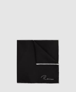 Crafted from silk, this black plain pocket square is complete with a contrast trim and the Reiss signature. Silk Contrast trim Length 32cm Width 32cm