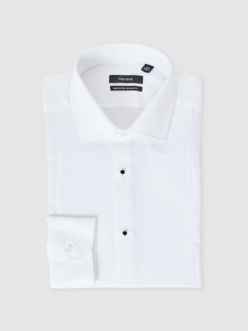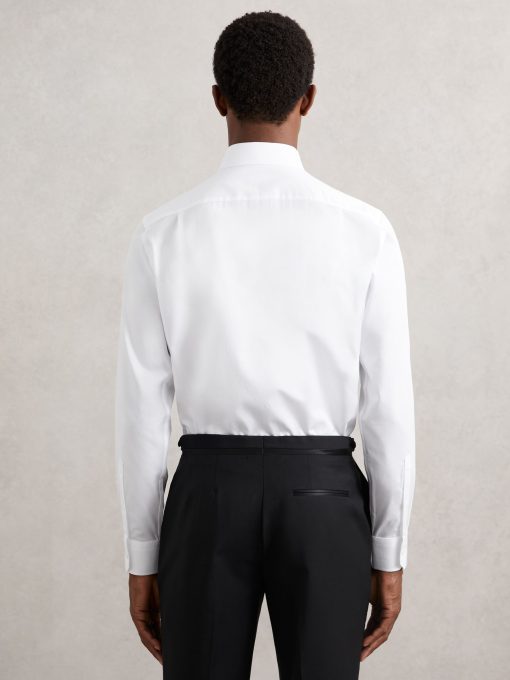 The White Marcel shirt is tailored for special occasions, crafted from 100% cotton with a subtly textured Marcella bib for a refined touch. Cut in a regular fit, it features a cutaway collar and glossy black buttons for a sophisticated finish. 100% cotton Regular fit Marcella bib Cutaway collar Button cuffs Contrasting front buttons