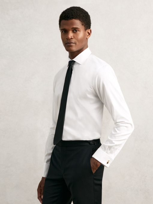 The White Remote shirt is crafted from 100% cotton satin for a subtle sheen and refined finish. Cut to a slim fit, it features a modern cutaway collar and double cuffs designed for cufflinks – ideal for formal occasions. 100% Cotton satin Slim fit Cutaway collar Double cuffs French button placket The model is wearing a size M. Measurements of model: Height 6ft 2.5″ / 189cm.