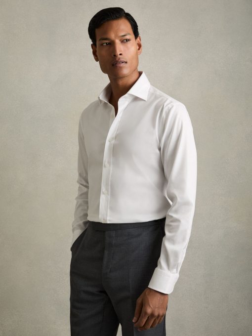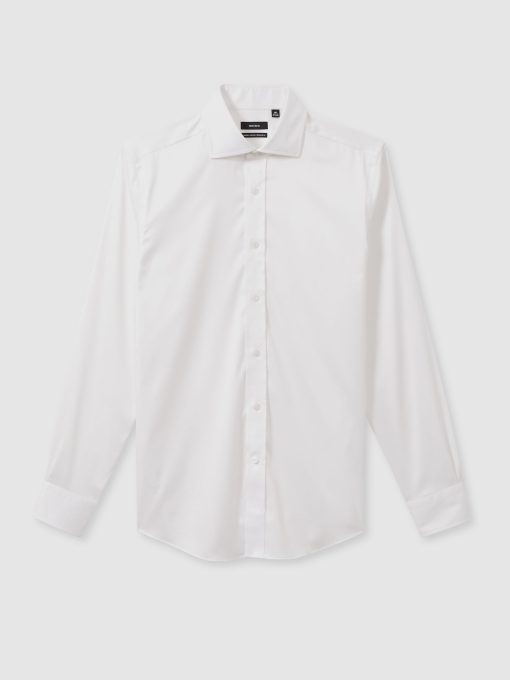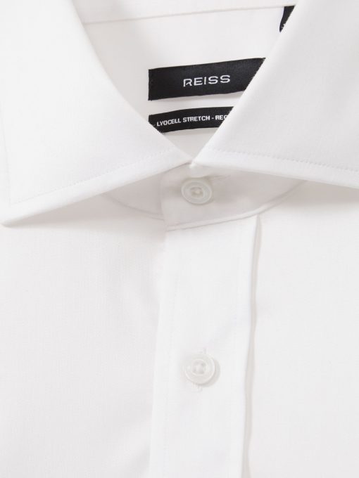 Crafted from cotton-Tencel with a hint of stretch, the white Bishopsgate shirt is the perfect addition to tailored looks. A spread collar adds refined structure to the neckline. Cotton-Tencel with stretch Spread collar Buttoned cuffs Front button placket Regular fit The model is wearing a size M. Measurements of model: 6ft 2″ / 189cm.