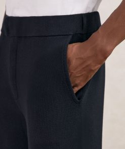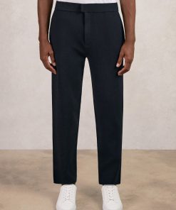 Knitted with fine ribs, the Arthur trousers combine structure with stretch for an elevated take on casualwear. Tailored to a tapered leg, they sit comfortably at the waist with an elasticated band and secure double hook-and-bar fastening. Fine rib knit: Tapered Elasticated waistband. Side slip pockets. Double hook-and-bar with zip. Regular inside leg length 28.5″ / 73cm.