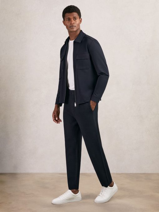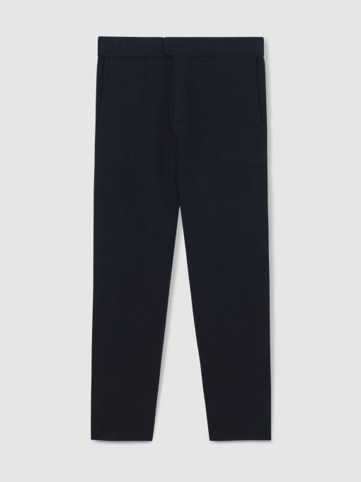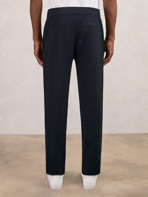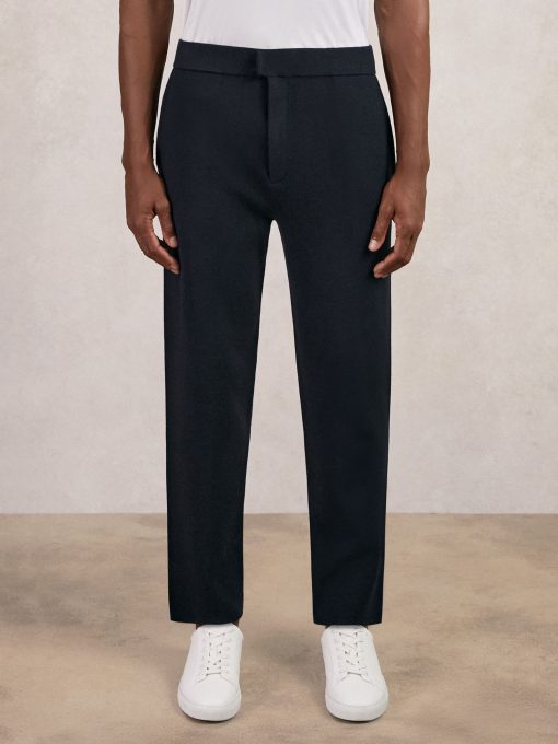 Knitted with fine ribs, the Arthur trousers combine structure with stretch for an elevated take on casualwear. Tailored to a tapered leg, they sit comfortably at the waist with an elasticated band and secure double hook-and-bar fastening. Fine rib knit: Tapered Elasticated waistband. Side slip pockets. Double hook-and-bar with zip. Regular inside leg length 28.5″ / 73cm.