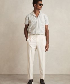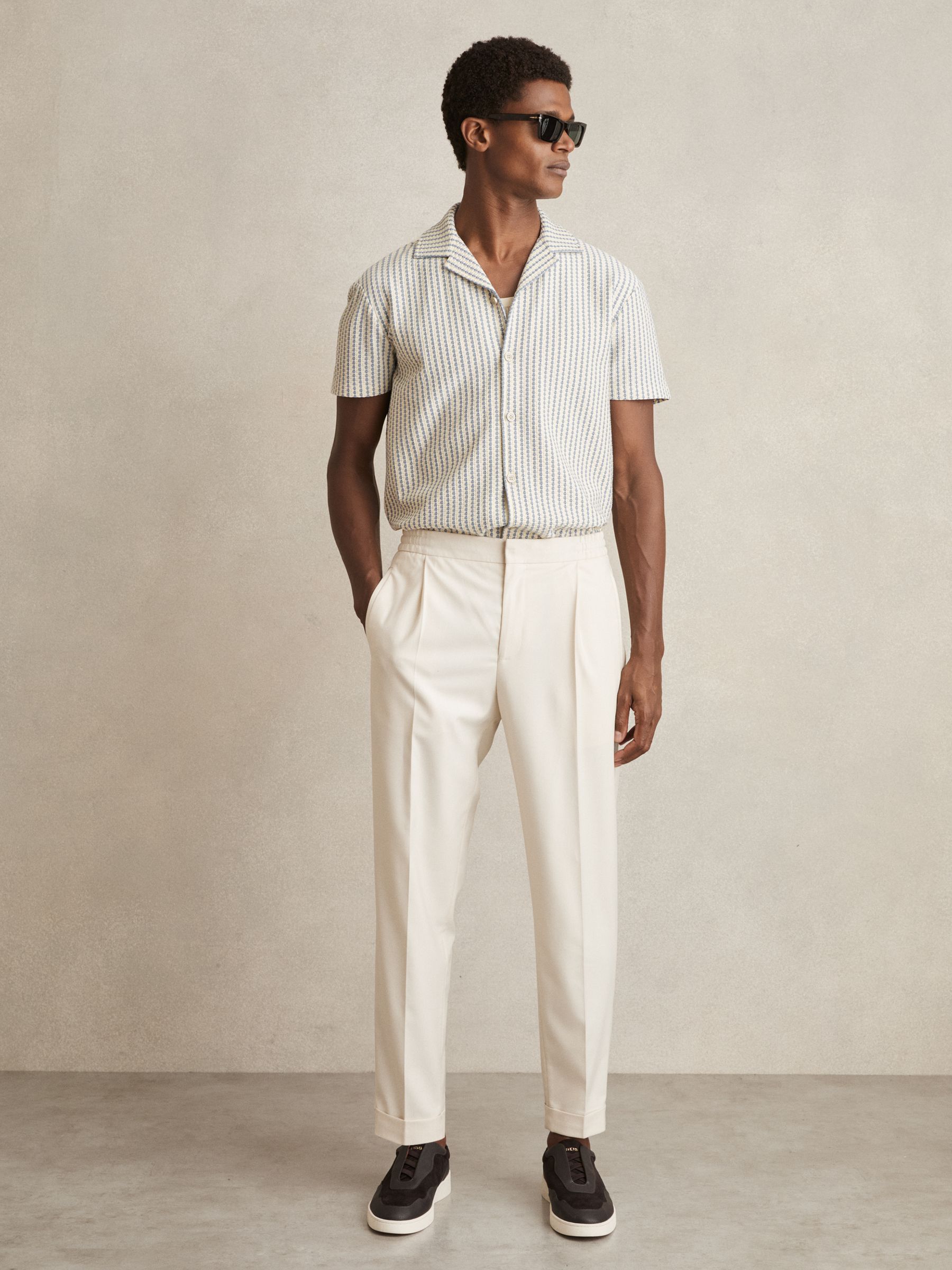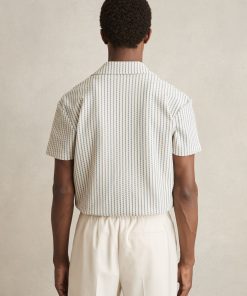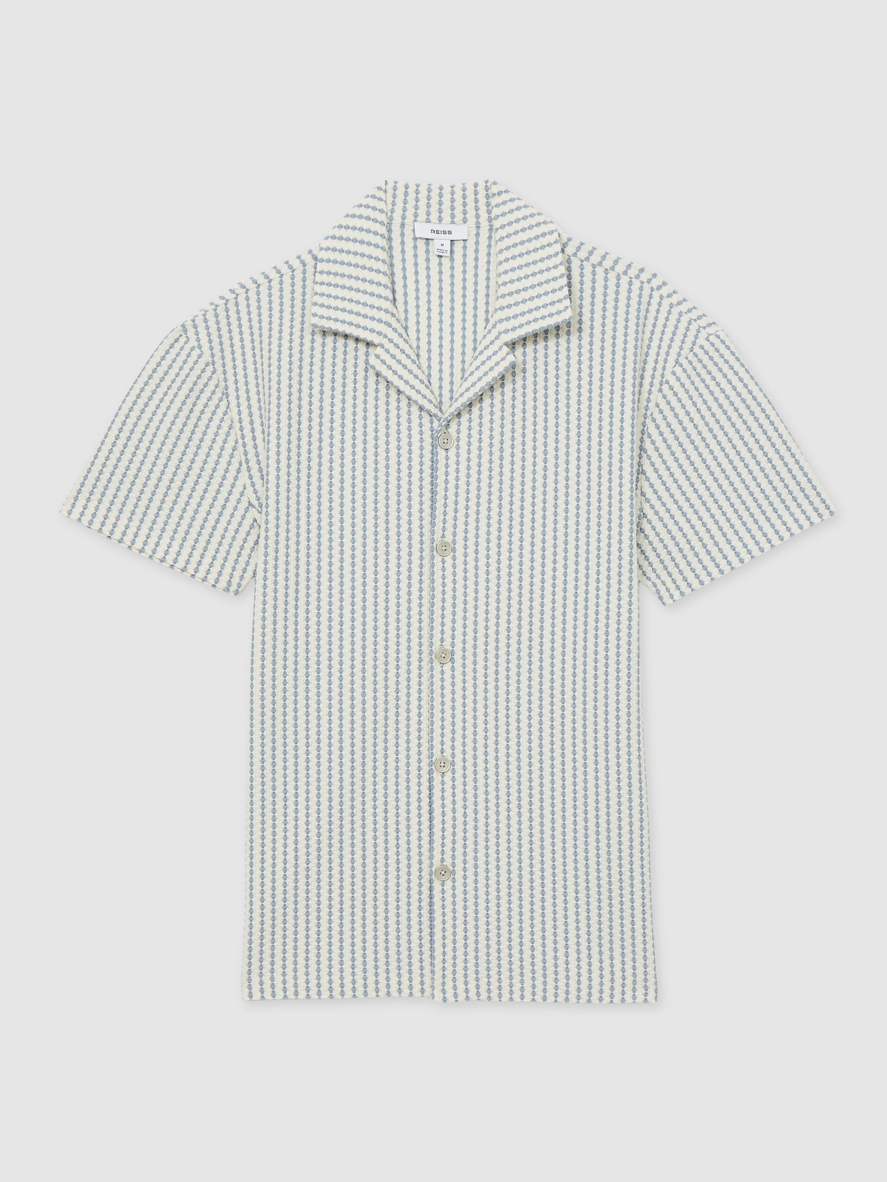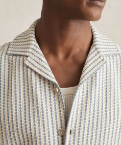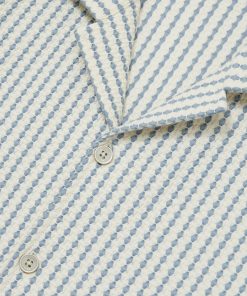 The White/Soft Blue Tower shirt is crafted with a textured stripe design and a seersucker finish, offering a cool, breathable feel. The Cuban collar adds a relaxed, stylish touch, perfect for warm-weather dressing. Cotton blend Seersucker finish Stripes Cuban collar Front buttons The model is wearing a size M. Measurements of model: Height 6ft 2.5″ / 189cm.