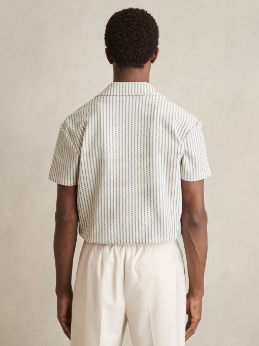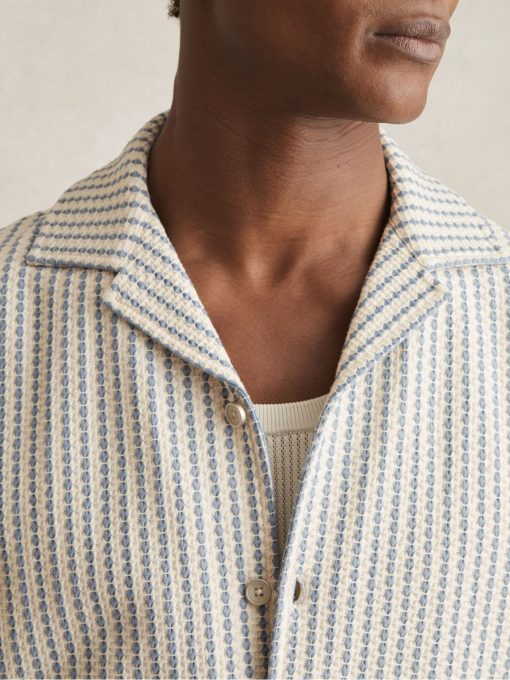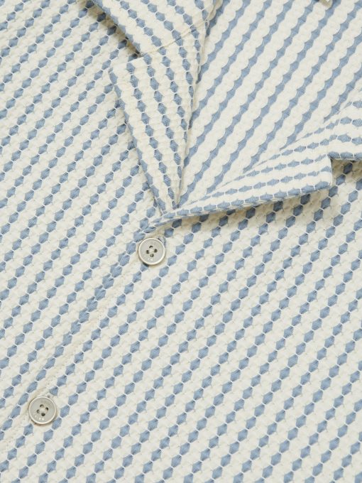 The White/Soft Blue Tower shirt is crafted with a textured stripe design and a seersucker finish, offering a cool, breathable feel. The Cuban collar adds a relaxed, stylish touch, perfect for warm-weather dressing. Cotton blend Seersucker finish Stripes Cuban collar Front buttons The model is wearing a size M. Measurements of model: Height 6ft 2.5″ / 189cm.