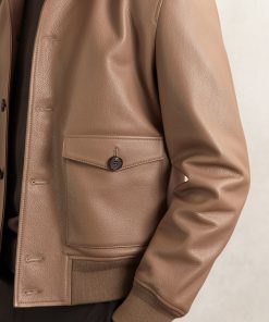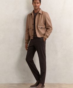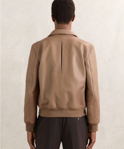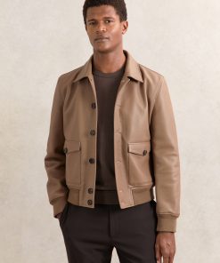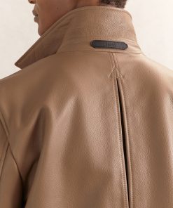 Tumbled leather gives the Brillow jacket a naturally supple, textured feel, while rib-knit hem and cuffs nod to its Harrington silhouette. Functional button flap pockets and a subtle logo patch at the nape add thoughtful style and understated character to the classic design. Tumbled leather Button flap pockets Rib-knit hem and cuffs Logo patch at nape Centre-back vent Front buttons The model is wearing a size M Measurements of model: Height 6ft 2.5 / 189cm Regular centre back neck to hem 26″ / 66cm.