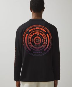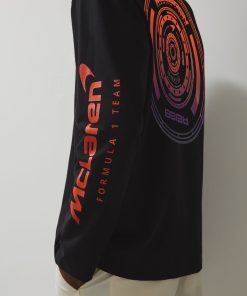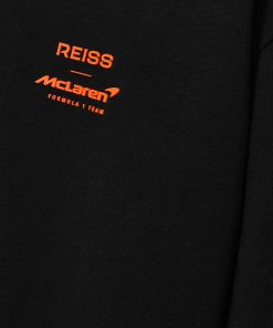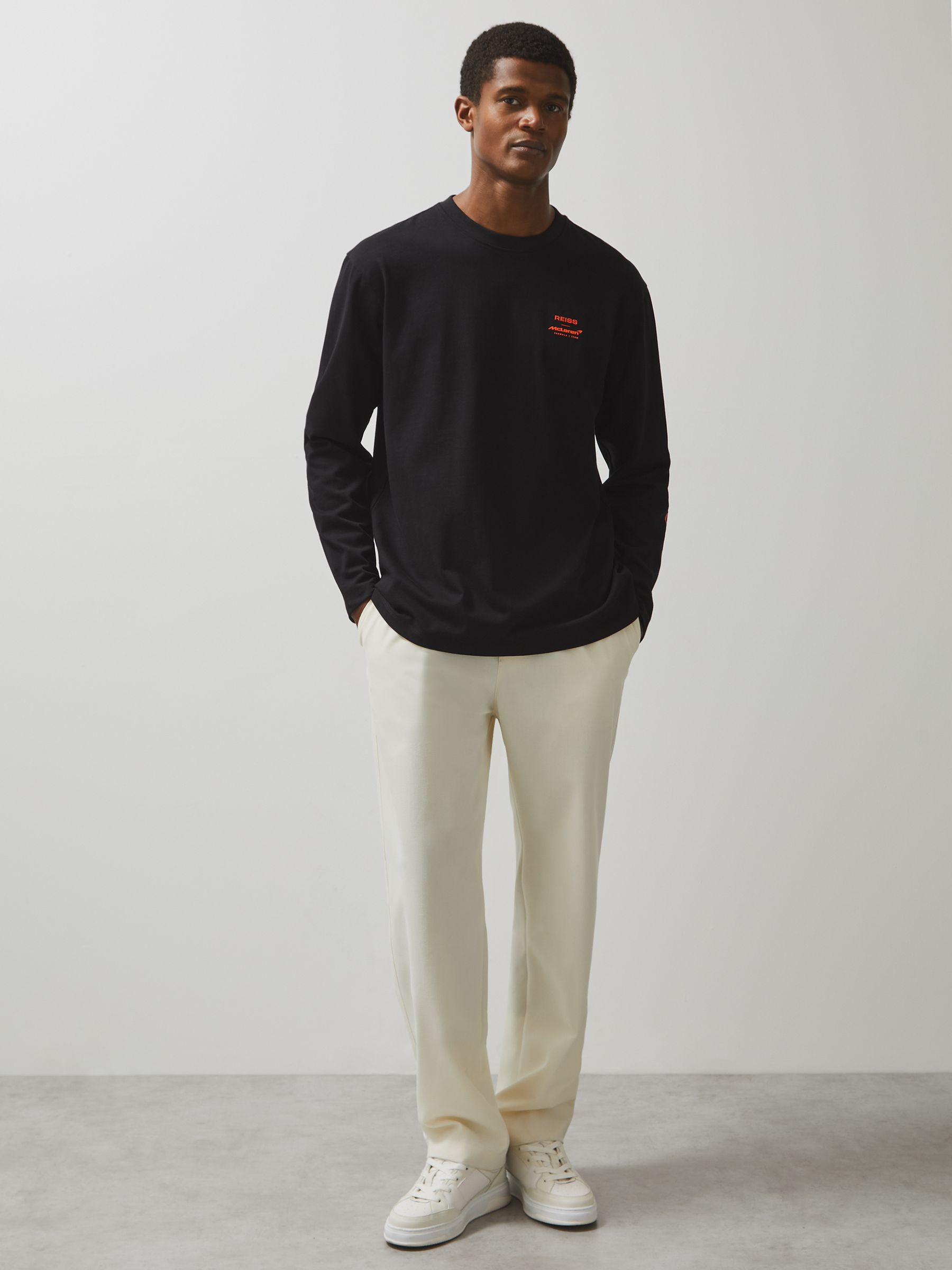 The Legacy McLaren Formula 1 Team Black T-Shirt is crafted from soft 100% cotton, featuring understated rubberised branding on the chest. Additional branding on the sleeve complements the design, while a bold ombré tyre print on the back, inspired by the speed and energy of racing, adds a striking finish. 100% cotton Rubberised McLaren F1 Team branding to chest McLaren F1 Team ombré tyre print to reverse Brand print to sleeve Crew neckline Unisex fit Presenting the Reiss x McLaren Formula 1 Team Collection Season 02, our exclusive collaboration with the McLaren Formula 1 Team. The model is wearing a size M. Measurements of model: Height 6ft 2.5″ / 189cm.