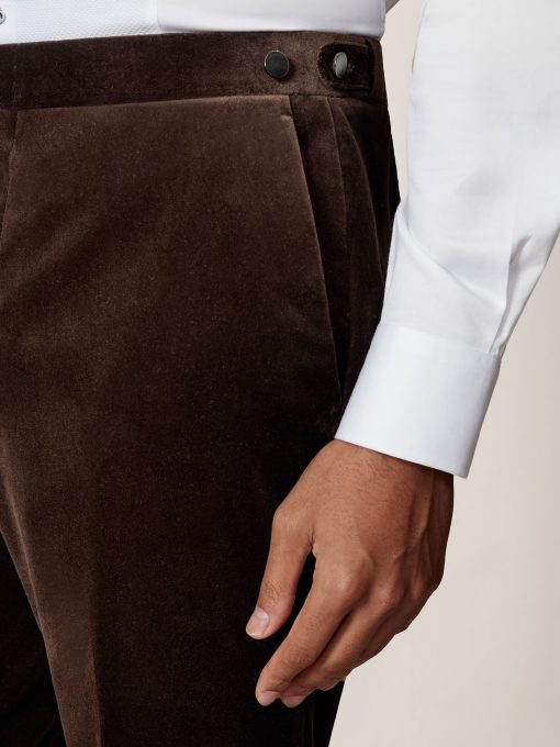 The Royale trousers are crafted from plush velvet for an elevated evening look. Cut to a sharp, tailored fit, they’re finished with side adjusters at the waist and lightly pressed creases.VelvetTailored fitButton side adjustersAngled side pocketsDouble welt back pocketHook-and-bar closure with zip Regular inside leg length 31.5″ / 80cm.