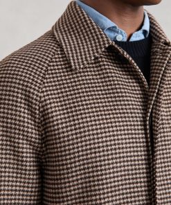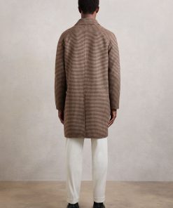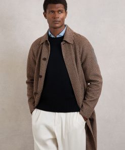 A classic houndstooth check lends a heritage feel to the Morpeth overcoat. It’s crafted from a wool blend with an ultra-soft brushed finish, and left unlined for a lighter wear. A single button is visible at the neck, with the remainder concealed for a streamlined effect. Brushed wool blend Houndstooth check Single-breasted Raglan sleeves Concealed front buttons Unlined Regular centre back neck to hem 40″ / 101cm.