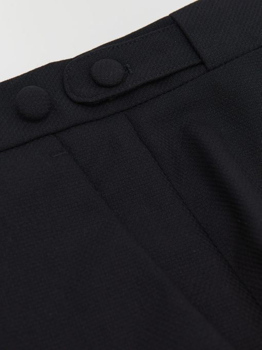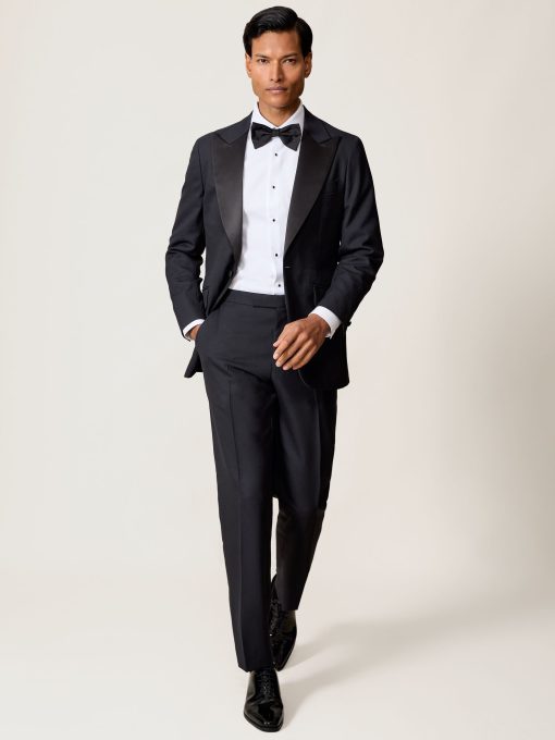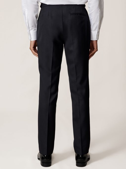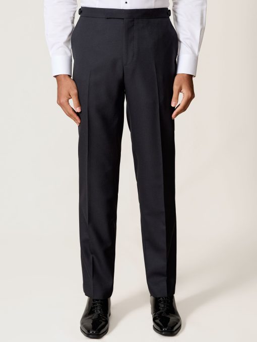 The Sinatra tuxedo trousers are crafted from a wool-blend jacquard, offering subtle texture and depth. Cut to a tailored fit, they feature button side adjusters and a hook-and-bar fastening with zip for a polished, party-ready finish. Wool blend Textured jacquard Tailored fit Button side adjusters Hook-and-bar with zip Regular inside leg length 31.5″ / 80cm.