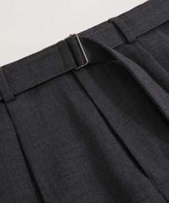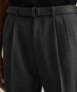 Tailored from a premium wool blend in a twill weave, the Charcoal Grey Strap trousers are the perfect choice for refined summer events. They’re cut for a regular fit and taper slightly towards the ankle for a modern silhouette. Elegant front pleats and slide-buckle belt offer a polished finish. Wool blend Twill weave Tailored fit Belt with slide buckle Front pleats Hook-and-bar with zip The model is wearing a size 32. Measurements of model: Height 6ft 2.5″ / 189cm. Regular inside leg length 28.5″ / 72cm.