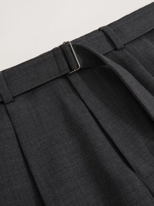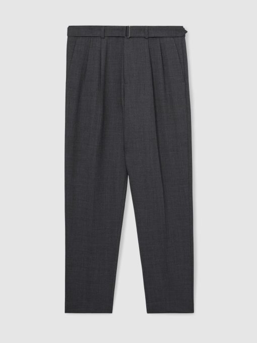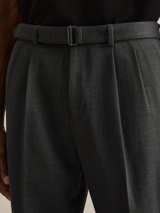 Tailored from a premium wool blend in a twill weave, the Charcoal Grey Strap trousers are the perfect choice for refined summer events. They’re cut for a regular fit and taper slightly towards the ankle for a modern silhouette. Elegant front pleats and slide-buckle belt offer a polished finish. Wool blend Twill weave Tailored fit Belt with slide buckle Front pleats Hook-and-bar with zip The model is wearing a size 32. Measurements of model: Height 6ft 2.5″ / 189cm. Regular inside leg length 28.5″ / 72cm.