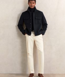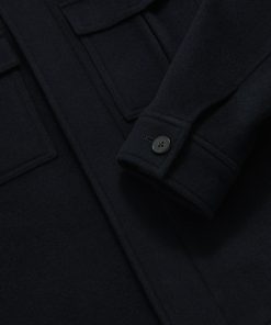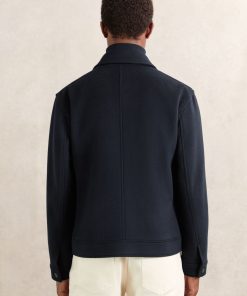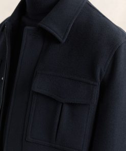 Softly tailored from a wool blend, the Navy Perisil jacket blends timeless design with a refined edge. A concealed zip front and pleated flap pockets refine the silhouette with clean, minimal detailing. Wool blend Pleated flap pockets Button cuffs Front zip with button placket The model is wearing a size M. Measurements of model: Height 6ft 2.5″ / 189cm. Regular centre back neck to hem 27″ / 68cm.