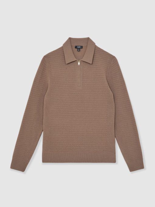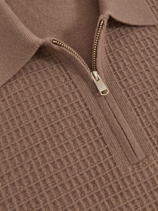 Knitted from 100% Wool, the Camel Brown Hamilton polo shirt features a textured waffle finish that adds depth to its casual shape. A half-zip neckline refines the look with a modern edge. 100% Wool Waffle knit Long sleeves Ribbed hem and cuffs Half-zip The model is wearing a size M. Measurements of model: 6ft 3″ / 190.5cm.