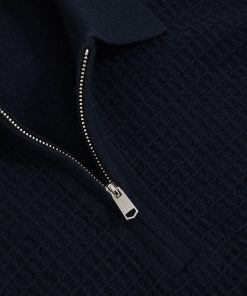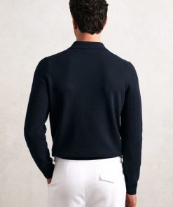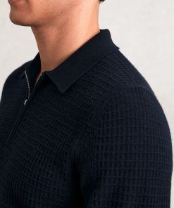 Knitted from 100% wool, the Navy Hamilton polo shirt features a textured waffle finish that adds depth to its casual shape. A half-zip neckline refines the look with a modern edge. 100% wool Waffle knit Long sleeves Ribbed hem and cuffs Half-zip The model is wearing a size M. Measurements of model: 6ft 3″ / 190.5cm.