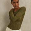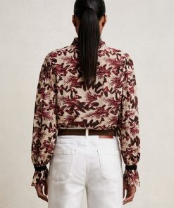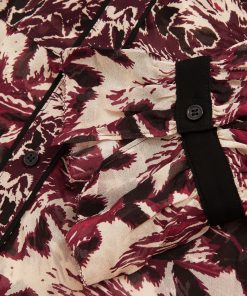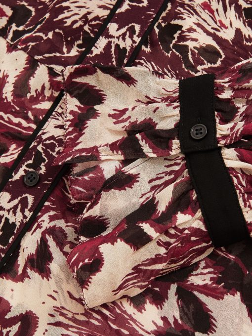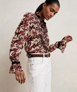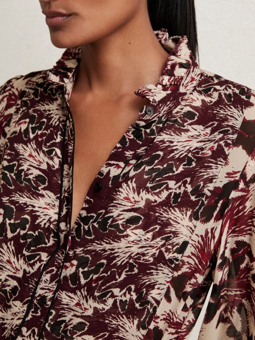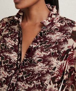 The Jules shirt is cut from lightweight crepe and decorated with an abstract print for a modern feel. A ruffled neckline and blouson sleeves with flared cuffs add soft, romantic volume. Crepe fabric. Abstract print. Ruffled neckline. Blouson sleeves with flared cuffs. Front button placket. The model is wearing a size 8 Measurements of model: Height 5 10″ / 177.8cm.