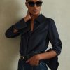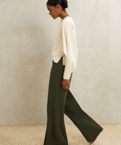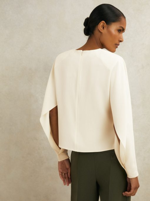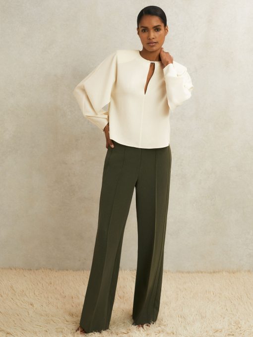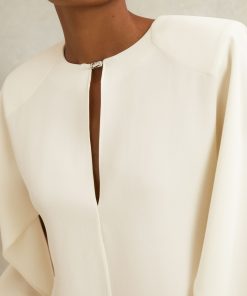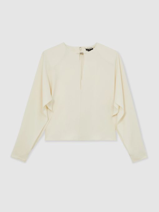 Fluid crepe shapes the Luella top into a softly draped silhouette, with partially split sleeves that gather at the cuffs to showcase sculpted volume. A keyhole neckline is secured with polished turn-lock hardware, while subtle shoulder padding refines the topline. Crepe fabrication, Keyhole neckline with turn-lock, Split sleeves with zip cuffs, Shoulder padding, Side hem slits, Concealed zip to reverse. Reiss Atelier is an elevated expression of our signature style, where timeless wardrobe staples and refined occasion pieces are crafted to be worn and loved for years to come.