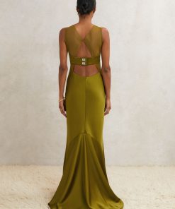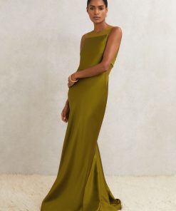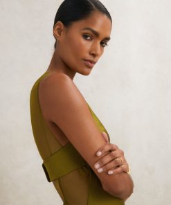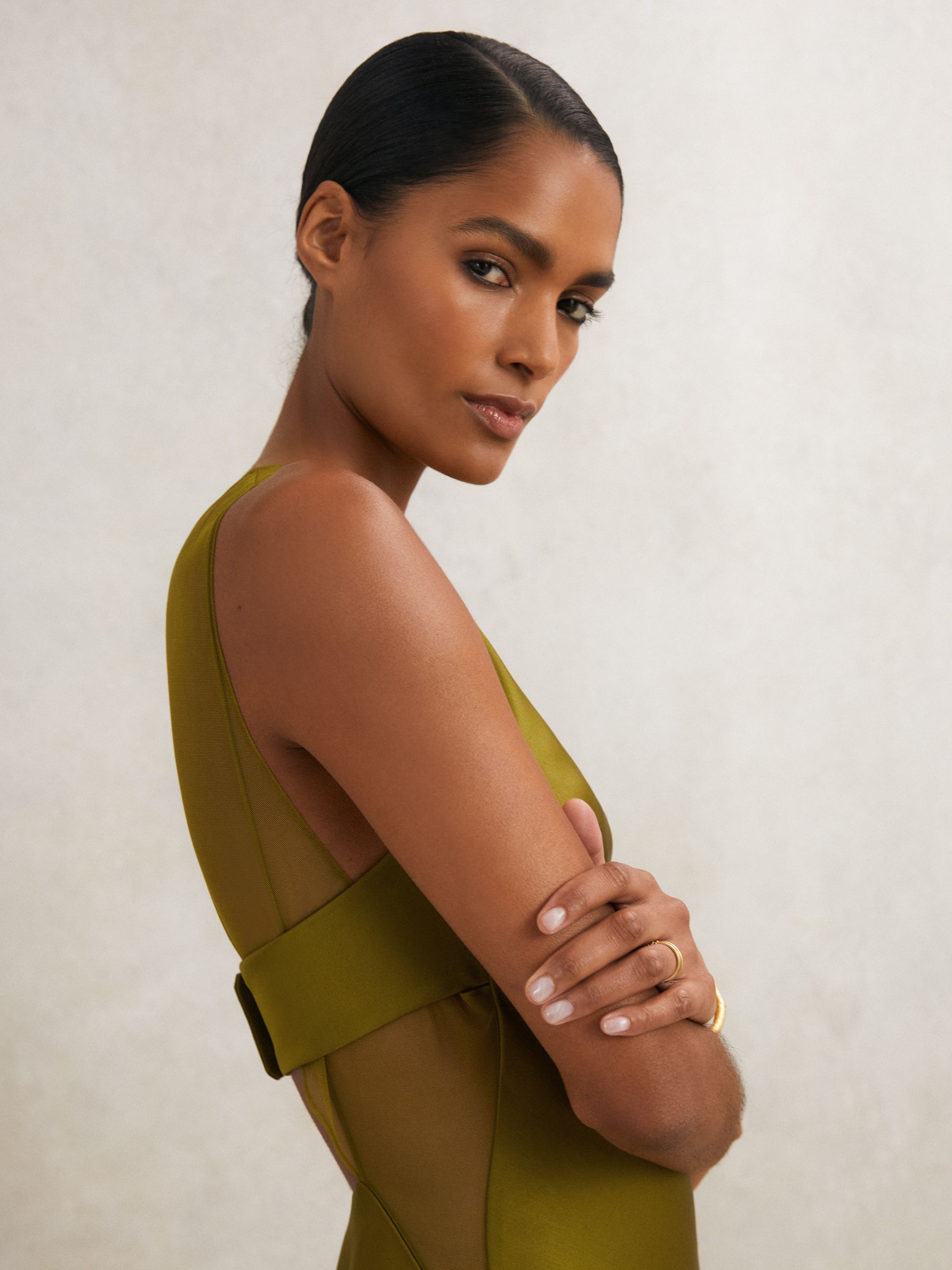 The Opi maxi dress is a standout occasion piece crafted from lustrous duchess satin, designed to fall with an elegant, fluid drape. Sheer mesh panels soften the topline and accentuate the back cut-outs, secured with polished turn-locks. A curved skirt panel extends into a short train, completing its refined silhouette.Duchess satinSheer mesh panelsCut-out back with turn-lock hardwareIn-built bra loopsFull liningConcealed zip to reverseReiss Atelier is an elevated expression of our signature style, where timeless wardrobe staples and refined occasion pieces are crafted to be worn and loved for years to come. Regular side neck to hem 58.5″ / 149cm.