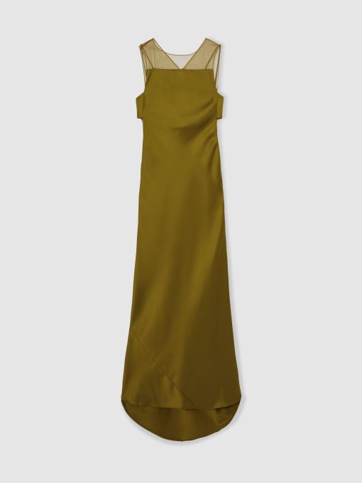 The Opi maxi dress is a standout occasion piece crafted from lustrous duchess satin, designed to fall with an elegant, fluid drape. Sheer mesh panels soften the topline and accentuate the back cut-outs, secured with polished turn-locks. A curved skirt panel extends into a short train, completing its refined silhouette.Duchess satinSheer mesh panelsCut-out back with turn-lock hardwareIn-built bra loopsFull liningConcealed zip to reverseReiss Atelier is an elevated expression of our signature style, where timeless wardrobe staples and refined occasion pieces are crafted to be worn and loved for years to come. Regular side neck to hem 58.5″ / 149cm.