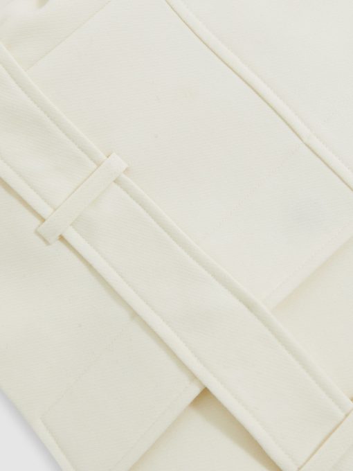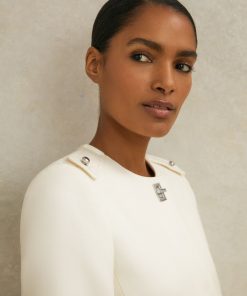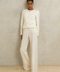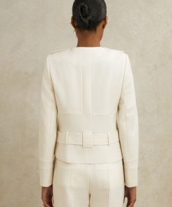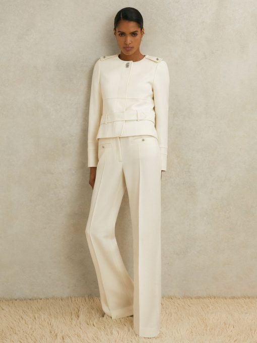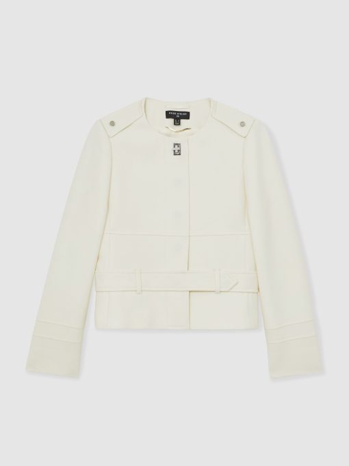 Tailored from premium wool twill, the Athena jacket offers a sharp, collarless silhouette defined by a stitched-on waist belt. Stud-detail epaulettes lend a military-inspired edge, while polished turn-lock hardware adds a refined finish. Premium wool twill Collarless design Stitched-on belt Stud-detail epaulettes Turn-lock hardware Concealed front magnetic snaps Reiss Atelier is an elevated expression of our signature style, where timeless wardrobe staples and refined occasion pieces are crafted to be worn and loved for years to come.