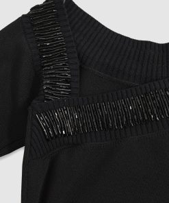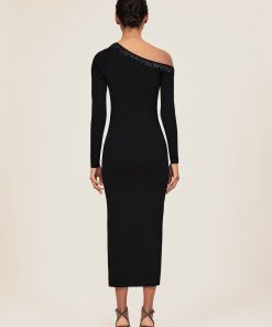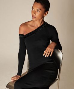 The Zaide dress is a stretch-knit style with a body-skimming fit. Its off-shoulder neckline is embellished with tonal bugle beads, adding an elegant eveningwear touch, while a high side slit and midi-length hem complete the sophisticated silhouette.Stretch knitOff-shoulder necklineBead embellishment Long sleevesSide slit Regular side neck to hem 48.5″ / 123cm.