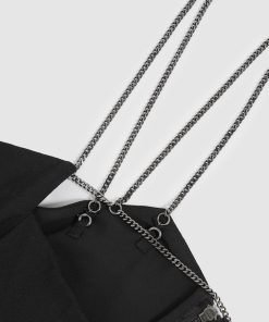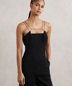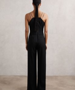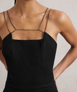 The Olara jumpsuit makes a striking statement for evening occasions. Silver-tone chains link together to form its shoulder straps and trace elegantly across the cut-out square neckline. With a fitted bodice and wide leg, it creates a sleek, elongating silhouette.Wide legCut-out square necklineChain-link strapsZip to reverse The model is wearing a size 8 Measurements of model: 5ft9 / 175cm Regular inside leg length 32.5″ / 82cm.