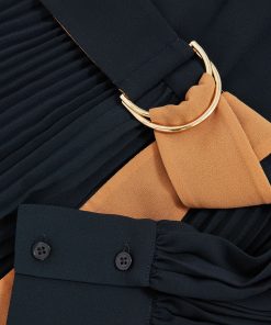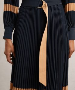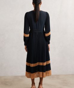 Elegant accordion pleats through the skirt and sleeves bring fluid movement to the Tori dress, crafted from lightweight crepe. Contrasting stripes offer bold definition to the design, echoing the subtle shoulder piping and the reverse of the belt. Accordion pleats. Contrast stripes. Gathered neckline. Button cuffs. D-Ring belt. Concealed zip to reverse. Regular side neck to hem 49.5″ / 126cm.